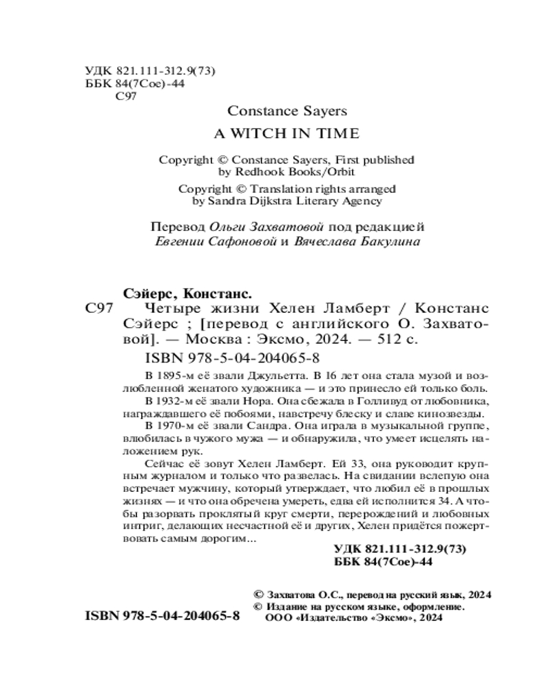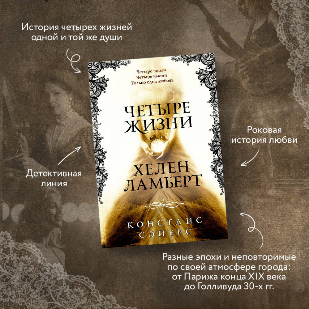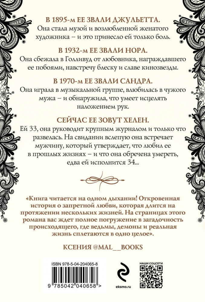 Четыре жизни Хелен ЛамбертВ данный момент этот товар отсутствует в продаже. Возможно, у нас найдется аналогичный или похожий товар здесь. В 1895-м её звали Джульетта. В 16 лет она стала музой и возлюбленной женатого художника — и это принесло ей только боль. В 1932-м её звали Нора. Она сбежала в Голливуд от любовника, награждавшего её побоями, навстречу блеску и славе кинозвезды. В 1970-м её звали Сандра. Она играла в музыкальной группе, влюбилась в чужого мужа — и обнаружила, что умеет исцелять наложением рук. Сейчас её зовут Хелен Ламберт. Ей 33, она руководит крупным журналом и только что развелась. На свидании вслепую она встречает мужчину, который утверждает, что любил её в прошлых жизнях — и что она обречена умереть, едва ей исполнится 34. А чтобы разорвать проклятый круг смерти, перерождений и любовных интриг, делающих несчастной её и других, Хелен придётся пожертвовать самым дорогим... |