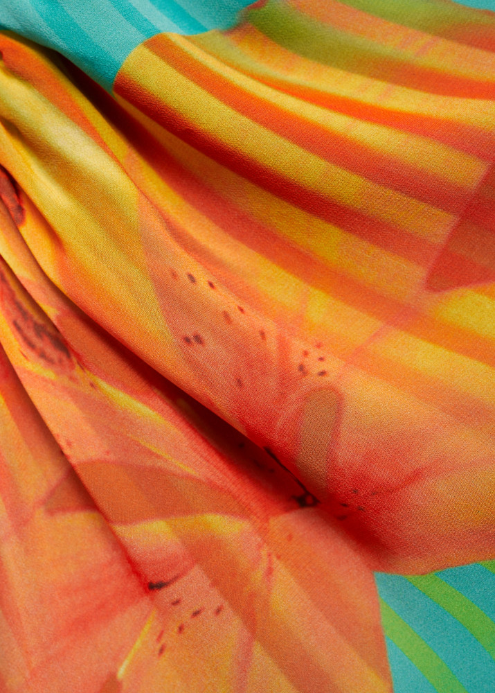Платье с принтом и декольте с отворотом. Струящаяся ткань. Ткань итальянского производства с принтом. Короткий фасон. Приталенный фасон. Без бретелей. Декольте с отворотом. Без рукавов. Узкие бретельки. На шее завязки. Подкладка. Многопозиционные бретельки.