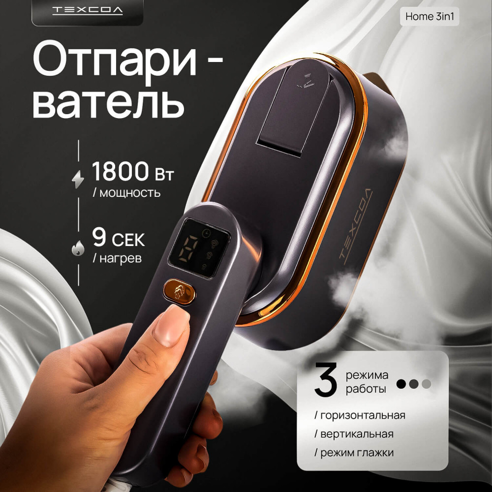 Компактный отпариватель ТЕХСОЛ Home 3in1 1800w для дома и поездок имеет три режима работы: вертикальное и горизонтальное отпаривание плюс режим глажки. Мощность 1800 Вт, быстрый нагрев за 9 секунд, температура пара до 160°C и керамическая подошва помогают быстро привести в порядок повседневную одежду, рубашки, шторы и тюль.