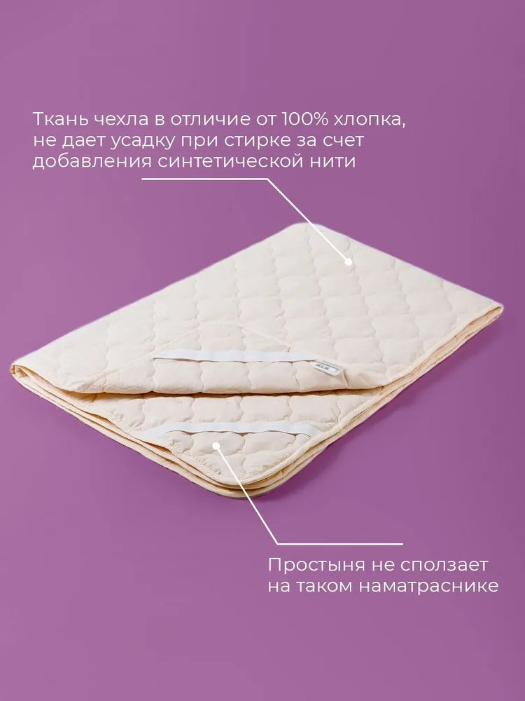 Качественный и более дорогой поликоттон — с высоким содержанием именно натуральной части, т.е. не менее 80% хлопка. Благодаря наматраснику из овечьей шерсти от Ecotex Ваш матрас будет чистым и служить дольше.