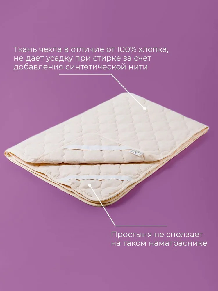 Качественный и более дорогой поликоттон — с высоким содержанием именно натуральной части, т.е. не менее 80% хлопка. Благодаря наматраснику из овечьей шерсти от Ecotex Ваш матрас будет чистым и служить дольше.