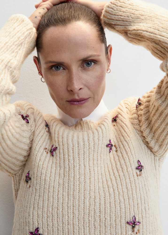 Действительно приятный материал , не выглядит дёшево или сплошной синтетикой . Размеру соответствует и даже немного маломерит . Мой размер уверенный М, так вот чтобы свитер сел , как в карточке товара нужен 48 .