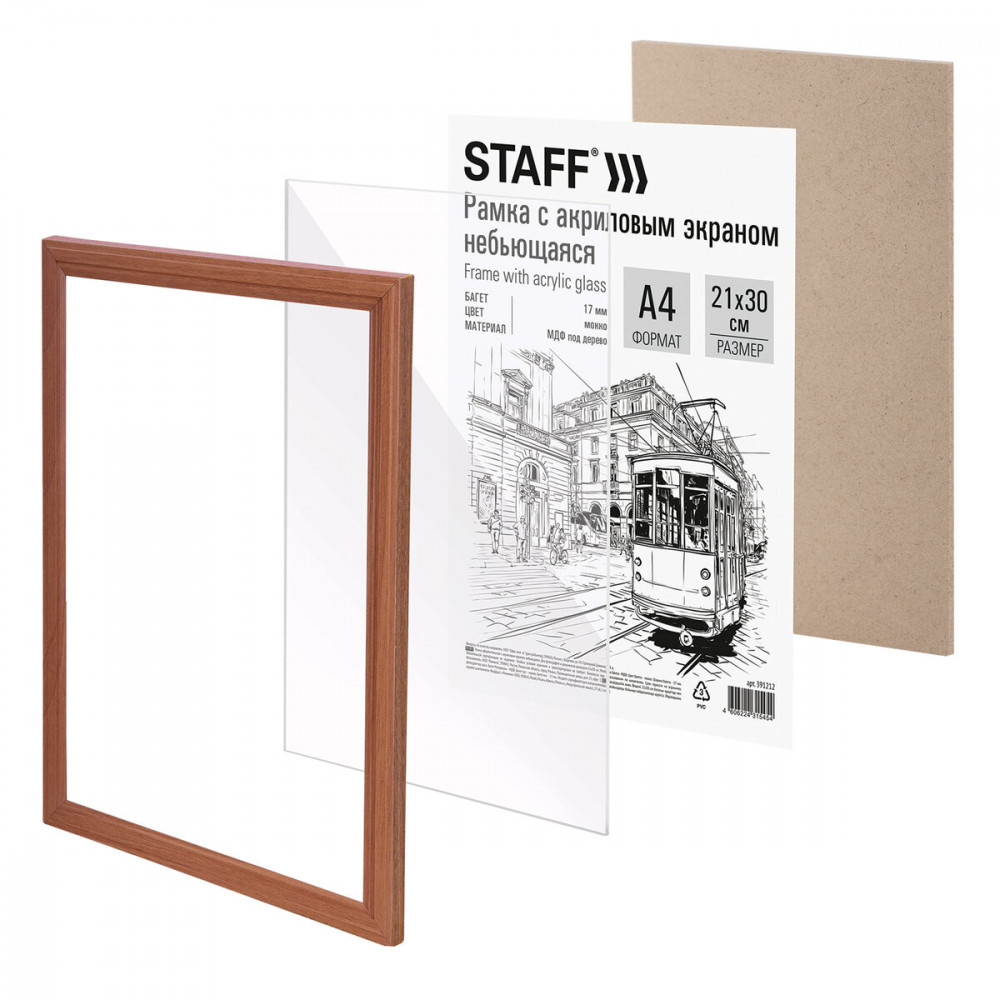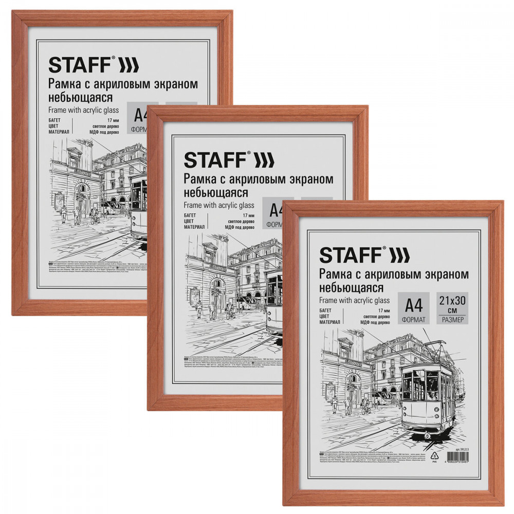 Комплект из 3-х рамок Staff «Carven», которые помогут оформить фотографии, сертификаты или другие ценные документы в едином стиле. Рамки будут эффектно смотреться в интерьере магазина, офиса и дома. Рамки формата А4 (21×30 см) выполнены из МДФ под дерево в цвете «светлое дерево», за счет чего отлично впишутся в домашний и деловой интерьер. Имеется возможность вертикального и горизонтального подвеса. Ширина багета каждой рамки — 17 мм. Благодаря экрану из акрилового стекла рамки являются менее хрупкими. Переплетный картон обеспечивает плотное прилегание и отсутствие в будущем деформации содержимого в рамке. Комплект из рамок поставляется в термоусадочной плёнке. Для дополнительной защиты от сколов и потертостей комплект упакован в индивидуальный трехслойный гофрокороб.