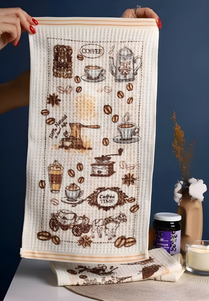 Полотенце кухонное «Кофе»В данный момент этот товар отсутствует в продаже. Возможно, у нас найдется аналогичный или похожий товар здесь. Это вафельное кухонное полотенце с тематическим принтом «Кофе» станет стильным и функциональным дополнением для вашей кухни. Полотенце украшено изображением кофейных чашек, кофейников, зерен кофе и других элементов, связанных с кофейной тематикой, что придаст кухне уют и элегантность. Благодаря натуральному составу, полотенце отлично впитывает влагу и легко стирается, сохраняя свой вид даже после множества стирок. Идеально подходят для ежедневного использования, оно станет прекрасным подарком для любителей кофе и тех, кто ценит красивые и практичные вещи в интерьере кухни. |
