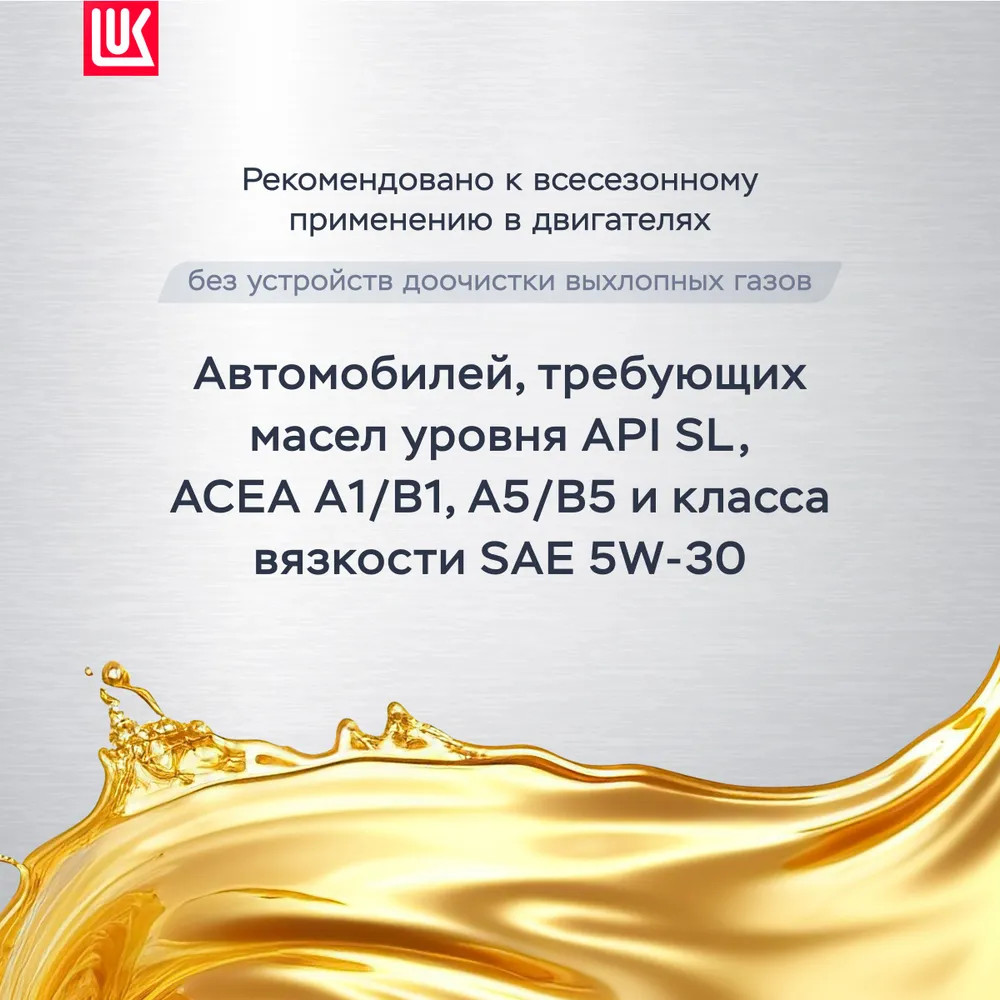 Лукойл Luxe Syntetic 5W-30 — синтетическое моторное масло для бензиновых и дизельных двигателей легковых автомобилей. Разработано на основе высококачественных компонентов, обеспечивающих превосходную защиту двигателя. Лукойл Luxe Syntetic 5W-30 рекомендовано к всесезонному применению в бензиновых и дизельных двигателях (без устройств доочистки выхлопных газов) автомобилей, требующих масел уровня API SL, ACEA A1/B1, A5/B5 и класса вяз-кости SAE 5W-30. Особенно рекомендуется для сервисного обслуживания двигателей автомобилей FORD, требующих соответствия спецификациям Ford WSS- M2C913-А, WSS-M2C913-В и WSSM2C913-C, а также двигателей автомобилей Renault требующих применения масел, одобренных в соответствии со спецификацией RN 0700.