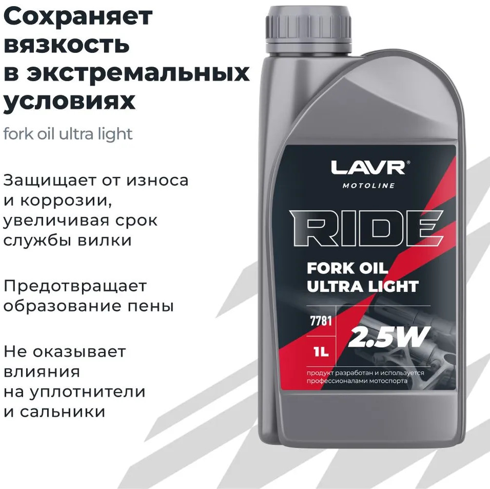 Вилочное гидравлическое масло предназначено для всех типов телескопических вилок мототехники для шоссейного и внедорожного применения. Изготовлено на основе нефтяных масел глубокой очистки и высокотехнологичного пакета присадок. Содержит комплекс антифрикционных, антикоррозийных и противопенных присадок, что сохраняет характеристики подвески и обеспечивает надёжную эксплуатацию телескопических вилок и амортизаторов. Не выпадает в осадок. Позволяет эксплуатировать мотоцикл в самых разнообразных климатических условиях.