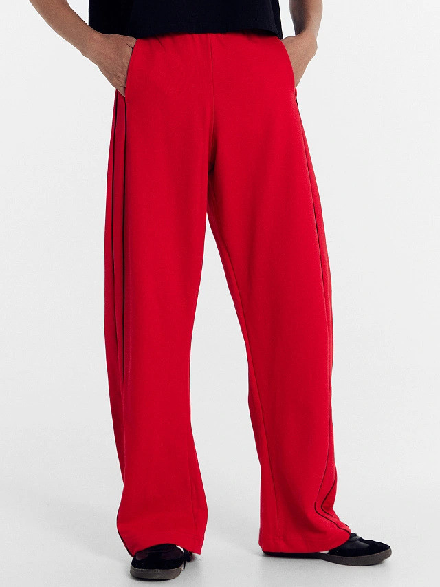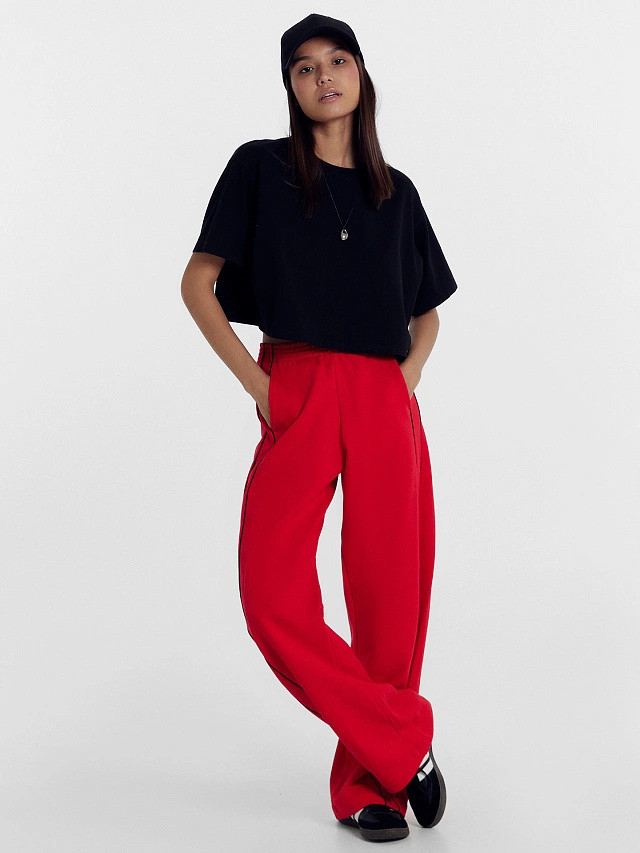 Плотный хороший материал, яркие. Длинные - носить с кроссовками-ботинками на высокой подошве (мой рост 167 см.) На свой размер М-L я взяла XS (других размеров уже не оставалось), как не странно, но подошли по размеру. У меня из этой же серии красная футболка есть - так что ношу как костюмчик - очень классно сидят вещи вместе.