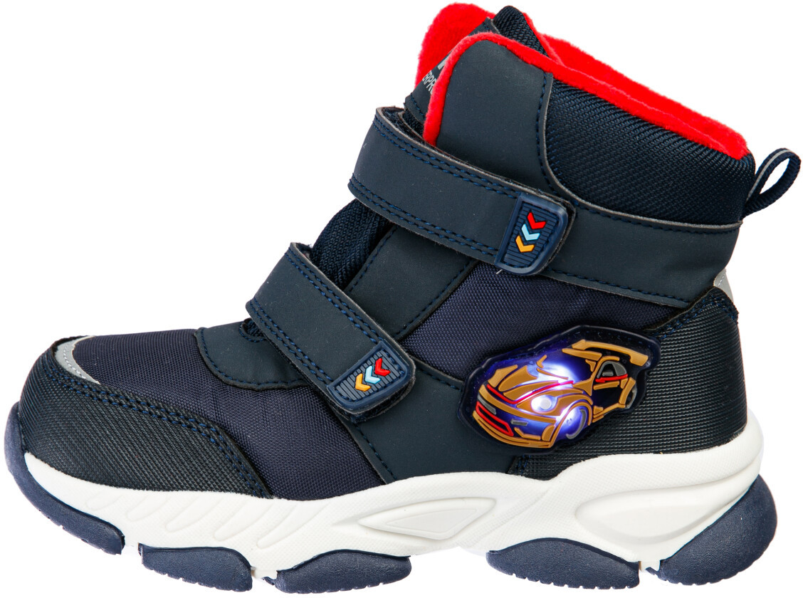 Конструкция верха изготовлена с использованием мембранных технологий. Усиленная защита носка и пятки специальными материалами. Подкладка из мягкого флиса. Съемная стелька выполнена из материала c высоким содержанием валеной шерсти 50% и обладает высокими теплозащитными свойствами. Формоустойчивый задник поддерживает стопу в правильном положении. Подошва имеет противоскользящий протектор. Удобная застежка-липучка. Рекомендованный температурный режим от 0°С до −15°С. Модель со светодиодной подсветкой, что позволяет хорошо видеть ребенка даже в темное время суток.