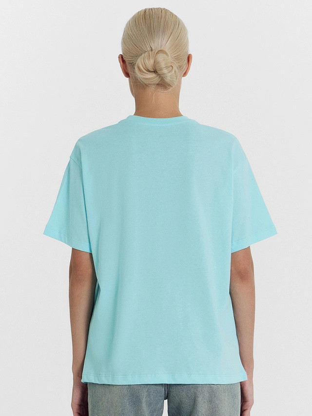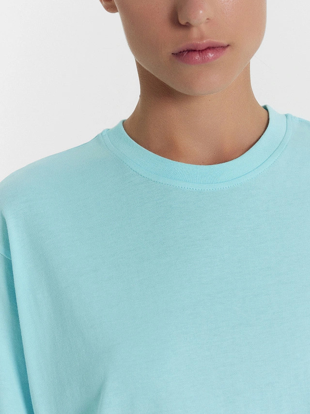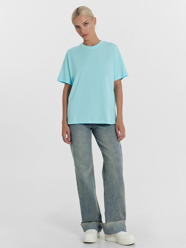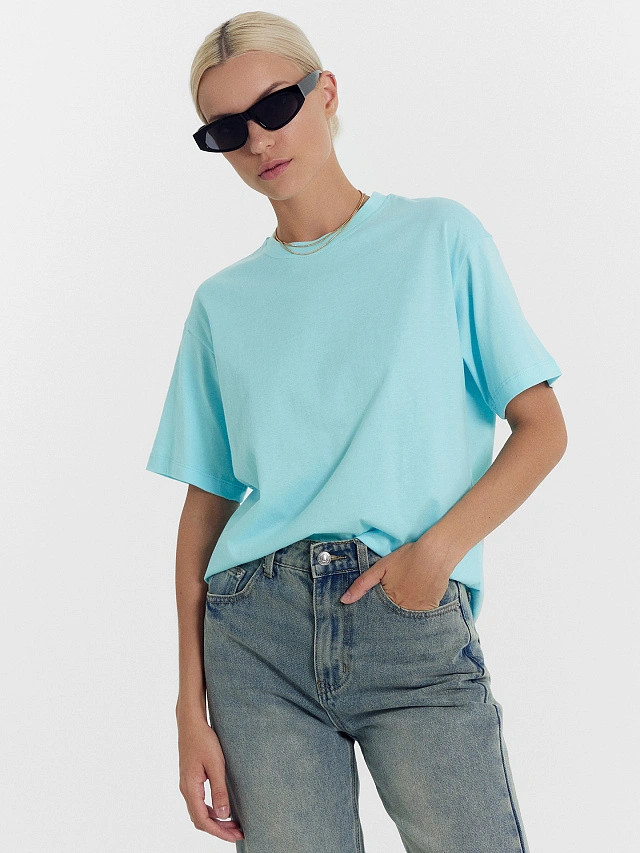 Мне очень понравилась эта футболка. Она свободная, но сидит очень аккуратно, не мешком. Цвет необычный и очень красивый.