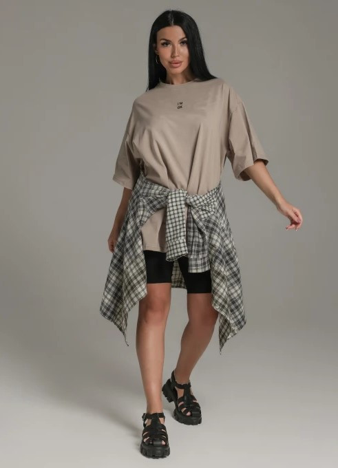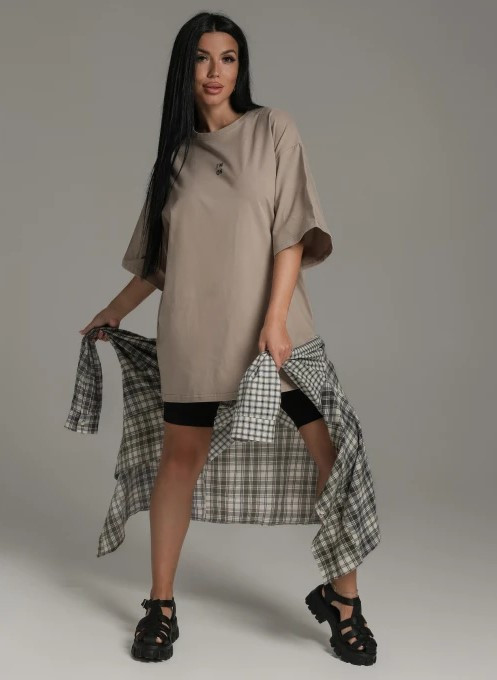 Мягкий трикотаж приятный к телу, действительно Оверсайз. И элегантная вышивка в верхней части груди. Цвет как на фото яркий и красивый. Рукав на 2 см выше локтя. Длина - при росте метр 70 - на три пальца выше паха.