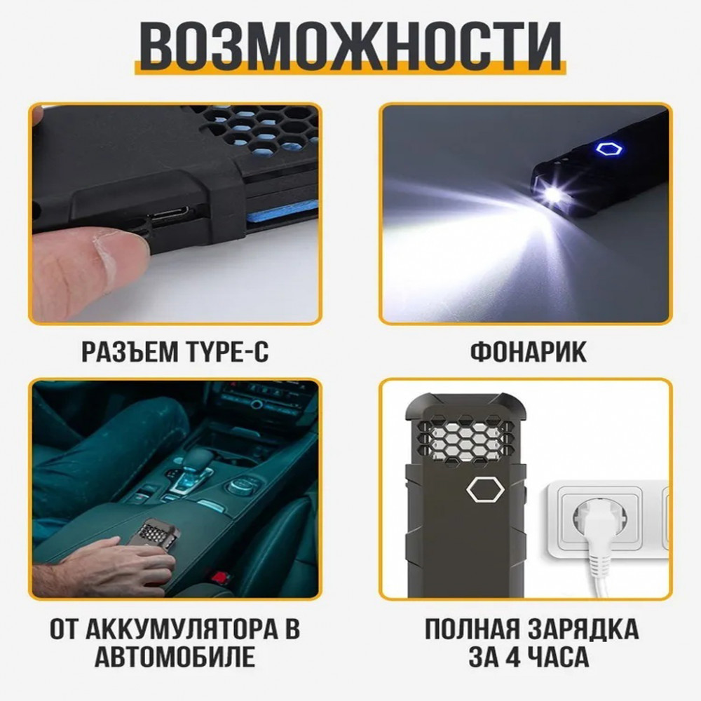 • аккумуляторный формат: работает без розетки, зарядка через USB-C от сети, автомобиля или пауэрбанка;