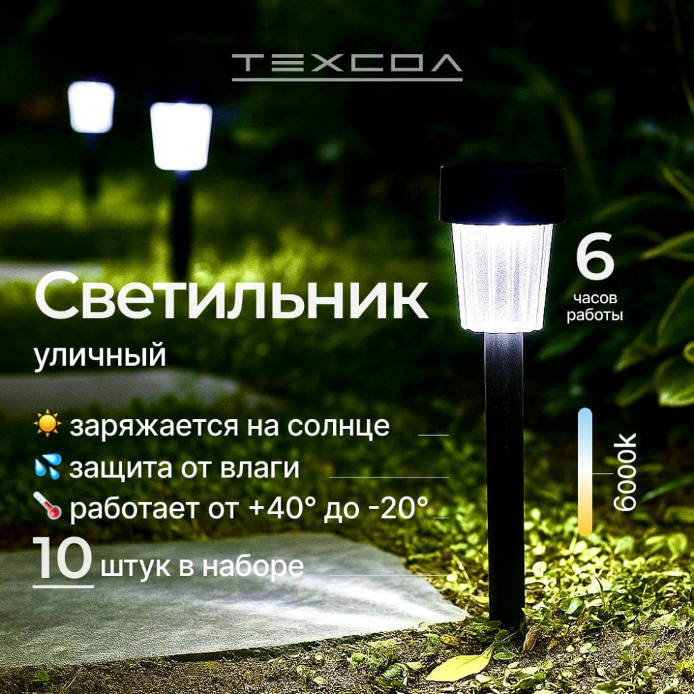 Уличный светильник Техсол LED 6000K-10pcs 30 см — солнечные, IP44, радиус подсветки до 1 метра. Набор из 10 солнечных садовых светильников для дорожек, клумб и террас. Холодный белый свет 6000K аккуратно подсвечивает контур, помогает ориентироваться в темноте и создаёт уют. Встроенный датчик сумерек включает светильник вечером автоматически. Проводка не нужна: при полном дневном заряде один светильник работает до 6 часов. Корпус защищён от дождя и пыли по IP44 и рассчитан на температуру от −20 до +40°C.