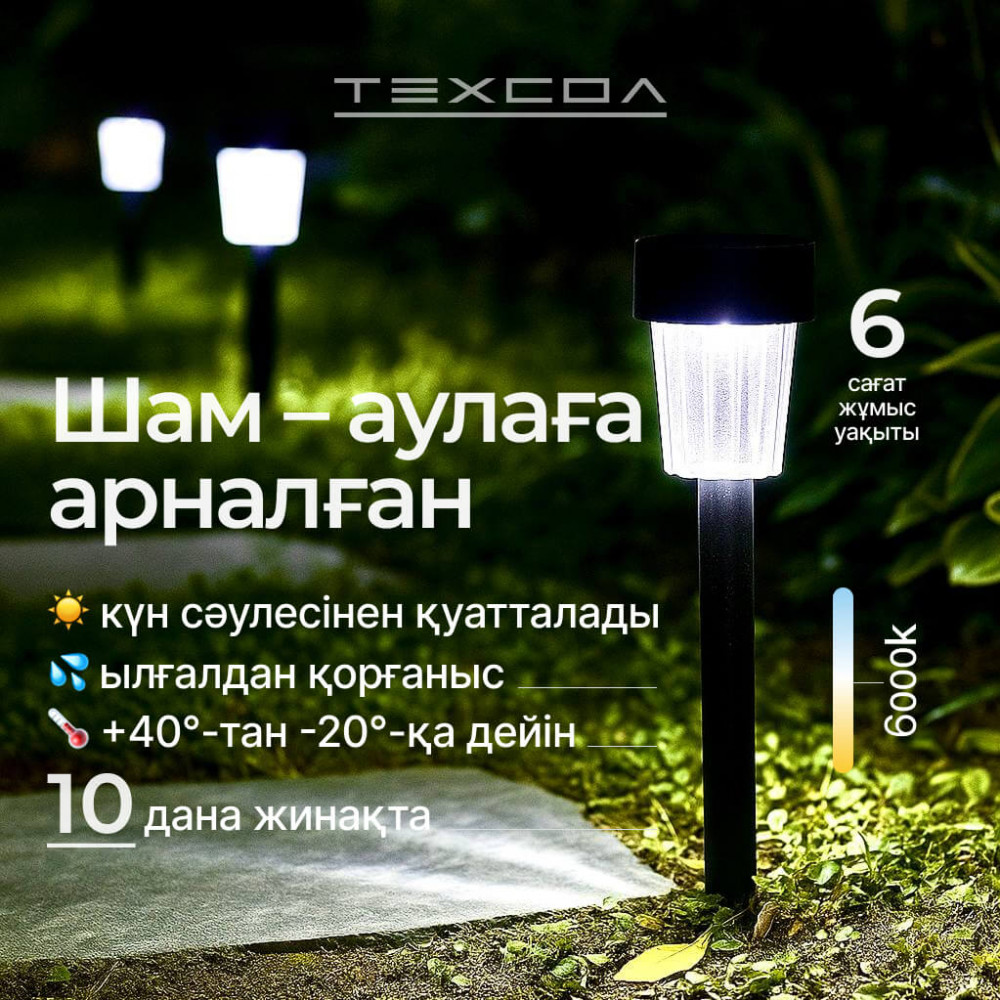 TEHSOL LED 6000K-10pcs 30 см көше шамдары — күннен қуаттанатын, IP44, шамамен 1 м радиус. Жол, гүлзар және террасаға арналған күннен қуат алатын 10 шамнан тұратын жинақ. 6000K суық ақ жарық жол жиегін әдемі көрсетіп, аулаға жайлы атмосфера береді. Кіріктірілген күн-түн датчигі кешкісін шамды автоматты түрде қосады. Сымсыз орнатылады, толық күндізгі зарядтан кейін бір шам түнде 6 сағатқа дейін жұмыс істейді. Корпус IP44 бойынша жаңбыр мен шаңнан қорғалған, −20...+40 °C диапазонында сенімді.