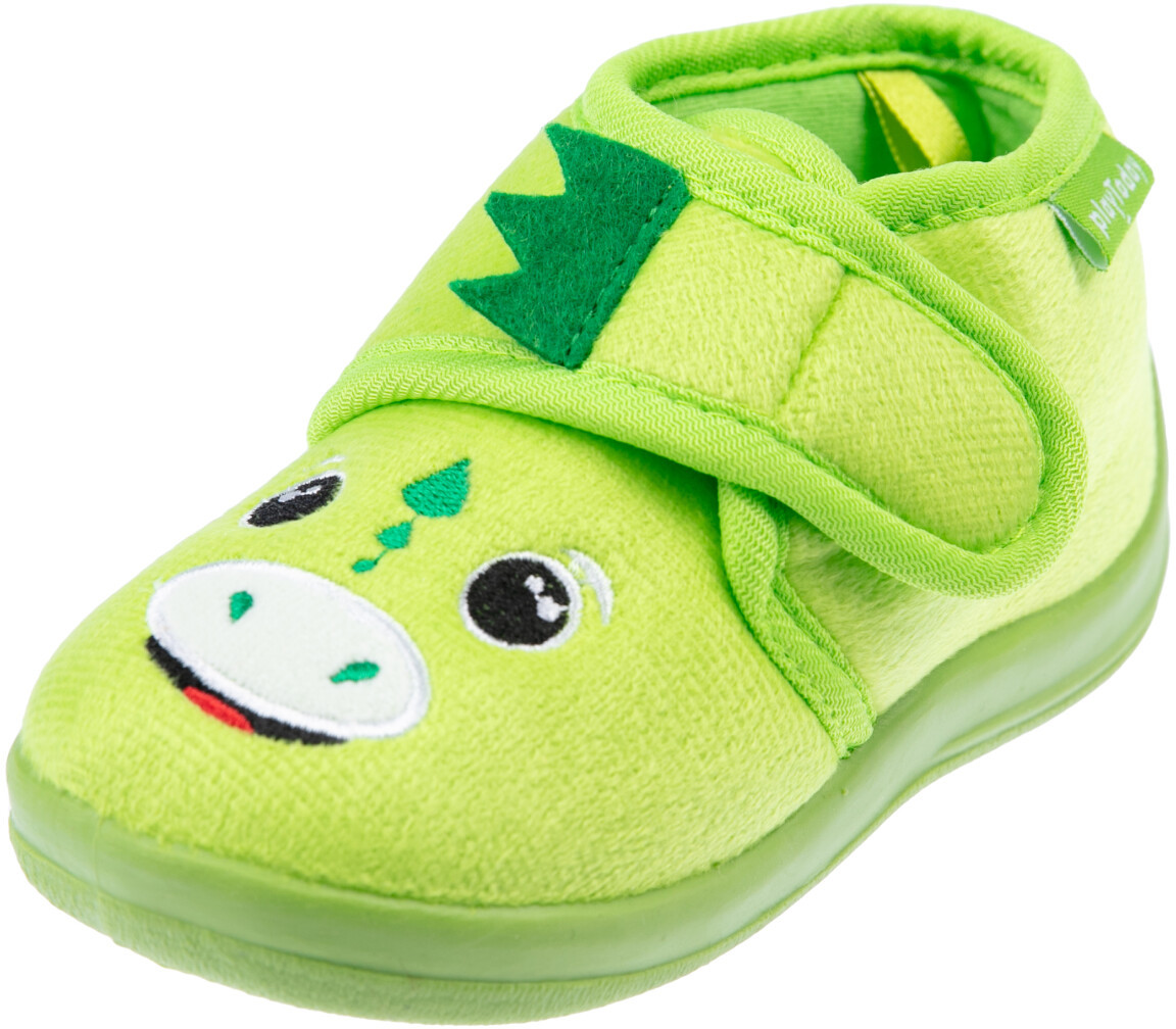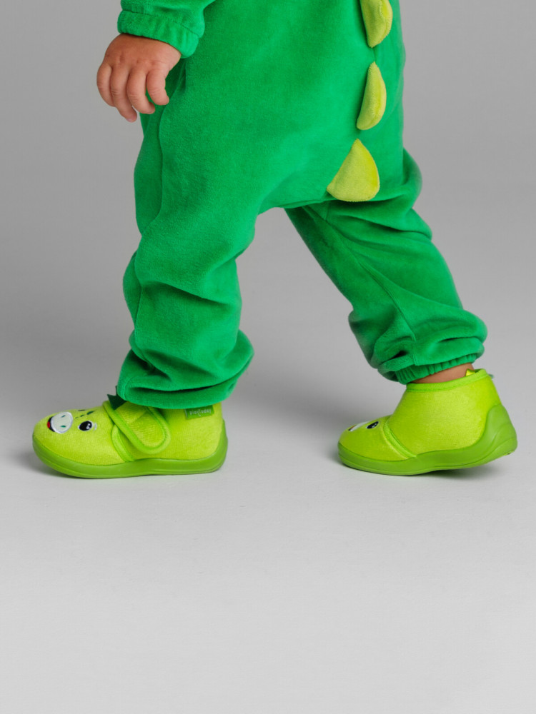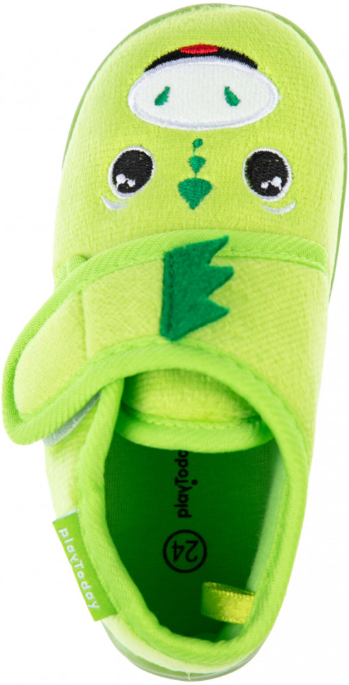 Верх тапочек выполнен из изностойкого текстиля с мягкой, приятной на ощупь поверхностью. Подкладка и стелька из трикотажа с высоким содержанием хлопка 95%. Противоскользящая подошва с защитой задней части. Конструкция с широкой липучкой позволяет легко обувать тапочки на малышей.