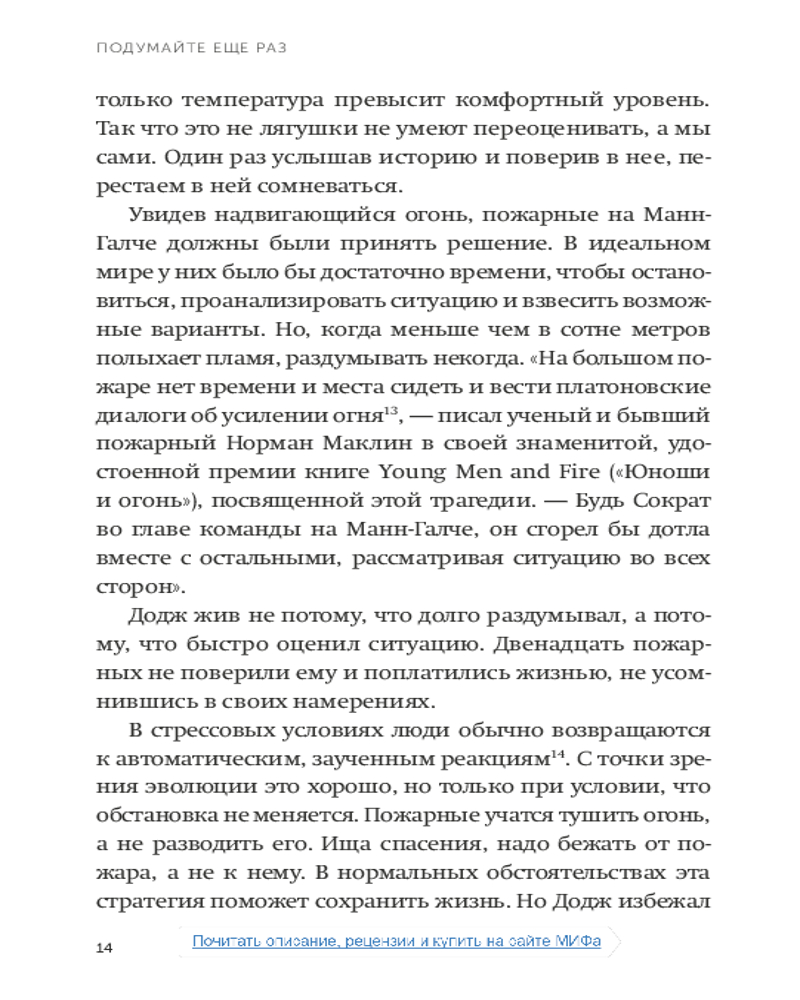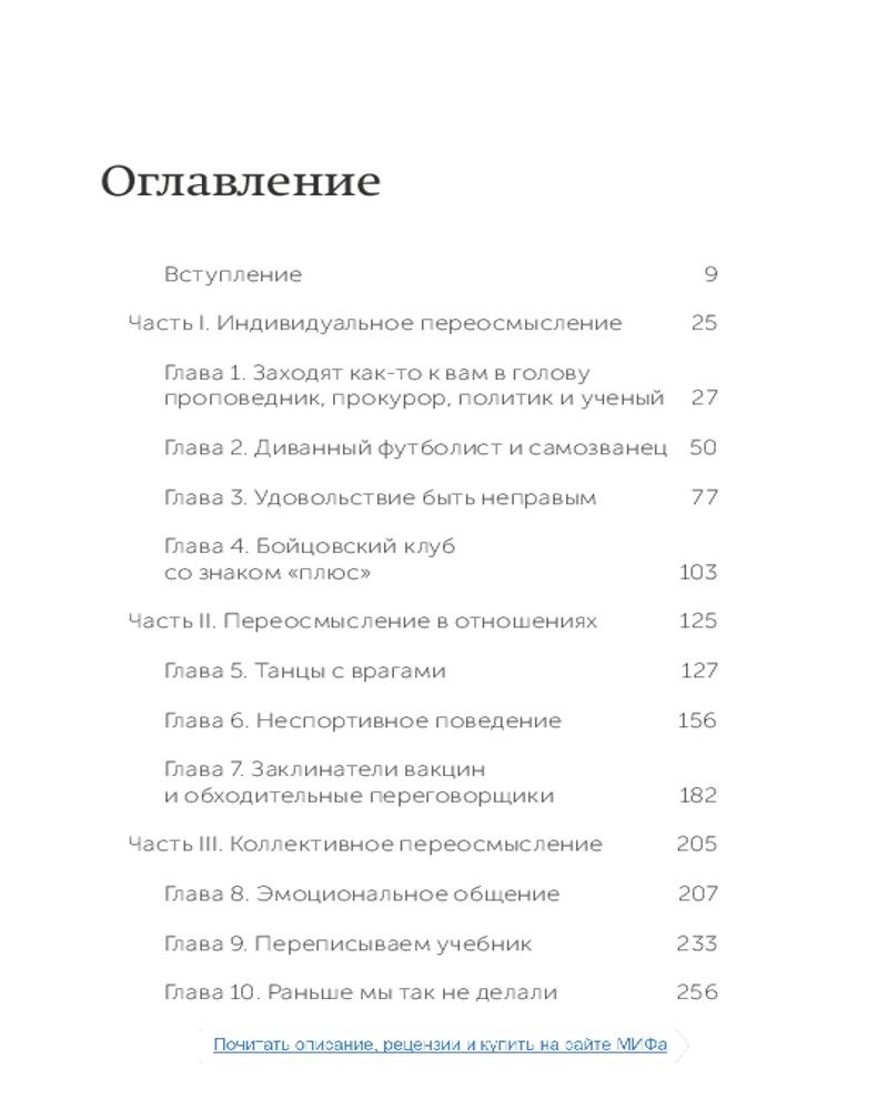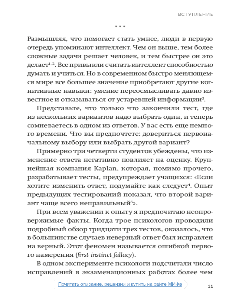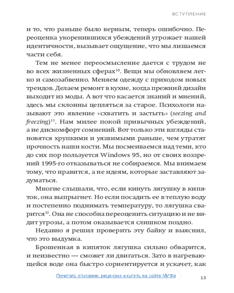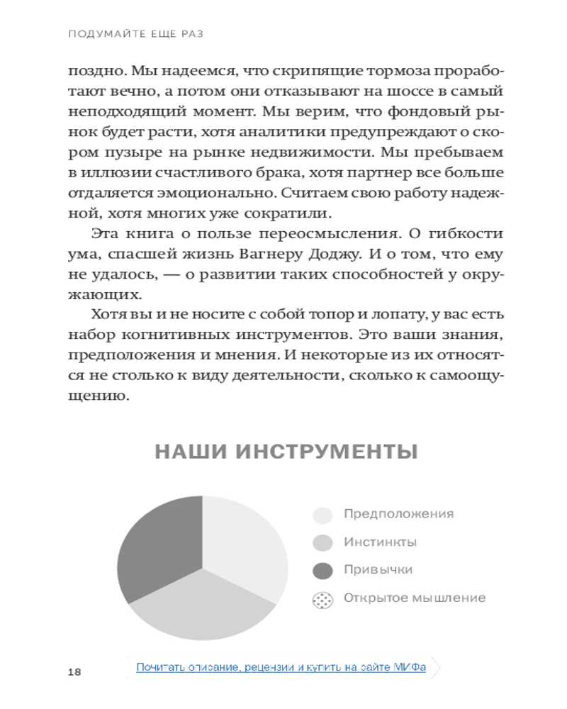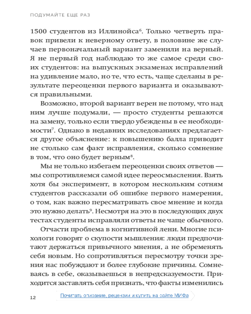 Подумайте еще раз. Сила знания о незнанииВ данный момент этот товар отсутствует в продаже. Возможно, у нас найдется аналогичный или похожий товар здесь. Серия: NEON Pocketbooks Интеллект обычно рассматривается как способность думать и учиться, но в быстро меняющемся мире есть еще один набор когнитивных навыков, которые могут иметь большее значение: способность переосмысливать и переучиваться. В повседневной жизни слишком многие из нас предпочитают комфорт убеждений неудобству сомнений. Мы прислушиваемся к мнениям, которые заставляют нас чувствовать себя хорошо, а не к идеям, призывающим задуматься. Мы рассматриваем разногласия как угрозу нашему эго, а не как возможность учиться. Мы окружаем себя людьми, которые согласны с нашими выводами, тогда как нам следует тяготеть к тем, кто бросает вызов нашему мыслительному процессу. |