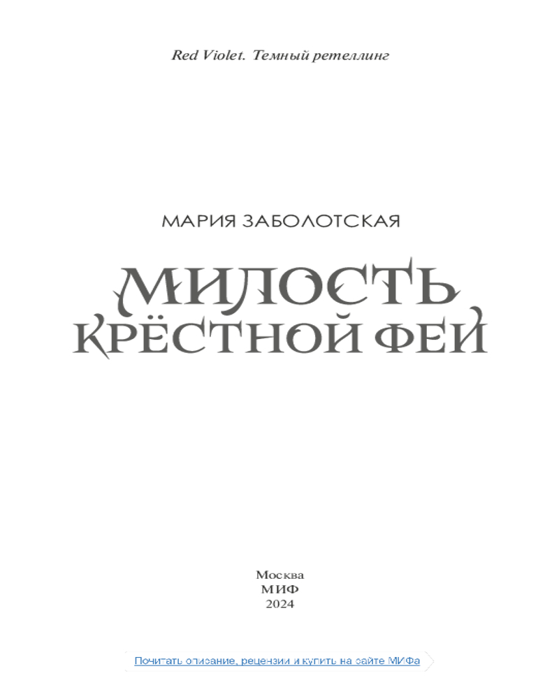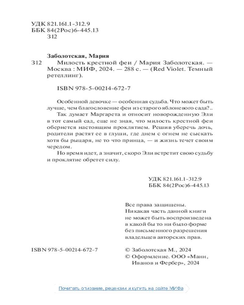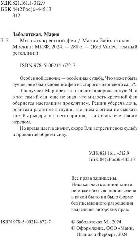 💳 Оплатить за товар можно при получении 🇰🇿 Есть бесплатная доставка по Казахстану от 1 дня 🎁 Копите бонусы с каждой покупки Серия: Red Violet. Темный ретеллинг Особенной девочке — особенная судьба. Что может быть лучше, чем благословение феи из старого яблоневого сада?.. |