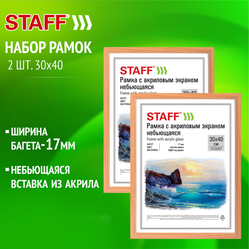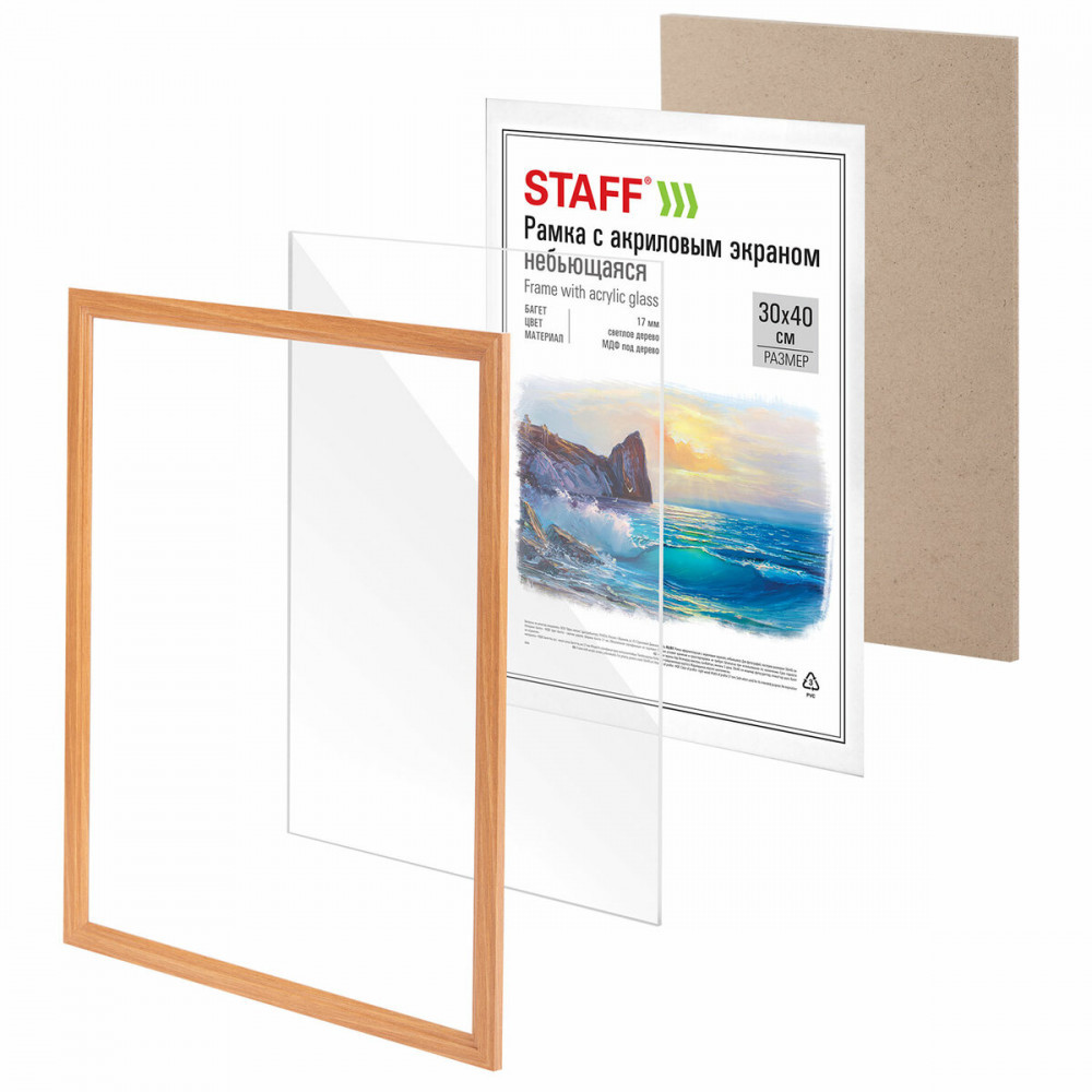 Рамки крупного формата А3 (30×40 см) выполнены из МДФ под дерево в цвете «светлое дерево», за счет чего отлично впишутся как в домашний, так и в деловой интерьер. У каждой рамки имеется возможность вертикального и горизонтального подвеса. Ширина багета — 17 мм, высота — 14 мм. Вставка из акрила вместо обычного стекла делает рамки менее хрупкими. Задняя панель рамок выполнена из переплетного картона, который обеспечивает плотное прилегание и отсутствие в будущем деформации содержимого рамок. Комплект из рамок поставляется в трехслойном гофрокоробе, при этом каждая рамка из комплекта индивидуально упакована в термоусадочную пленку.