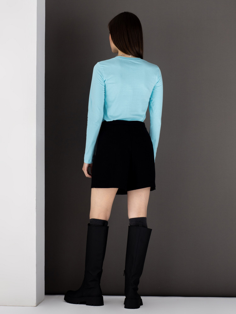 Лонгслив прямого покроя с втачным длинным рукавом. По линии горловины втачен ворот из эластичного полотна с 5% добавлением лайкры. Перед и спинка цельнокроеные. Плечевые швы обтачены бейкой из основного полотна, в край проложена отделочная строчка. Низ и рукава подогнуты и подшиты на распошивальной машине.