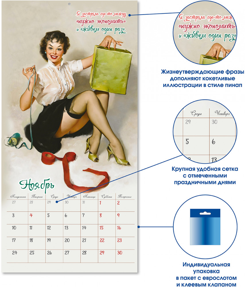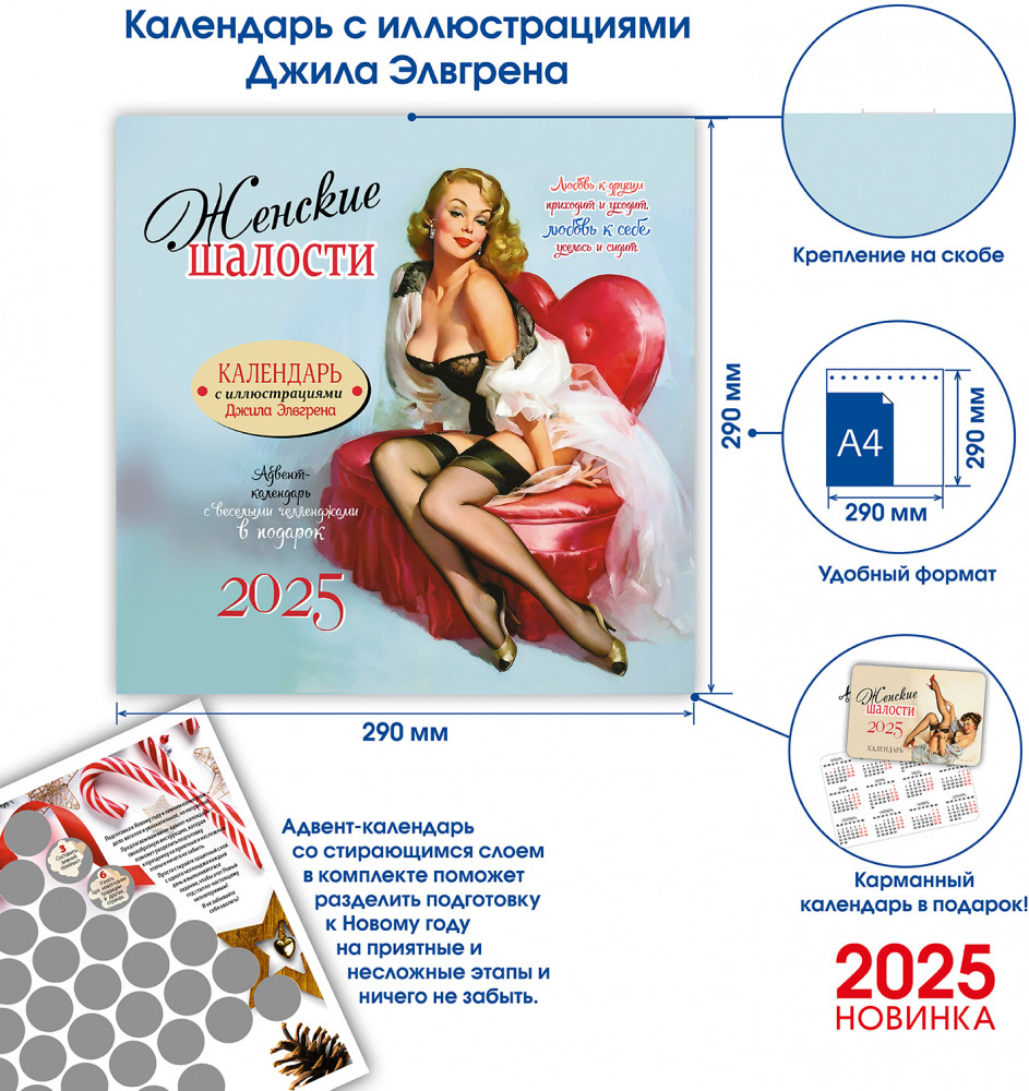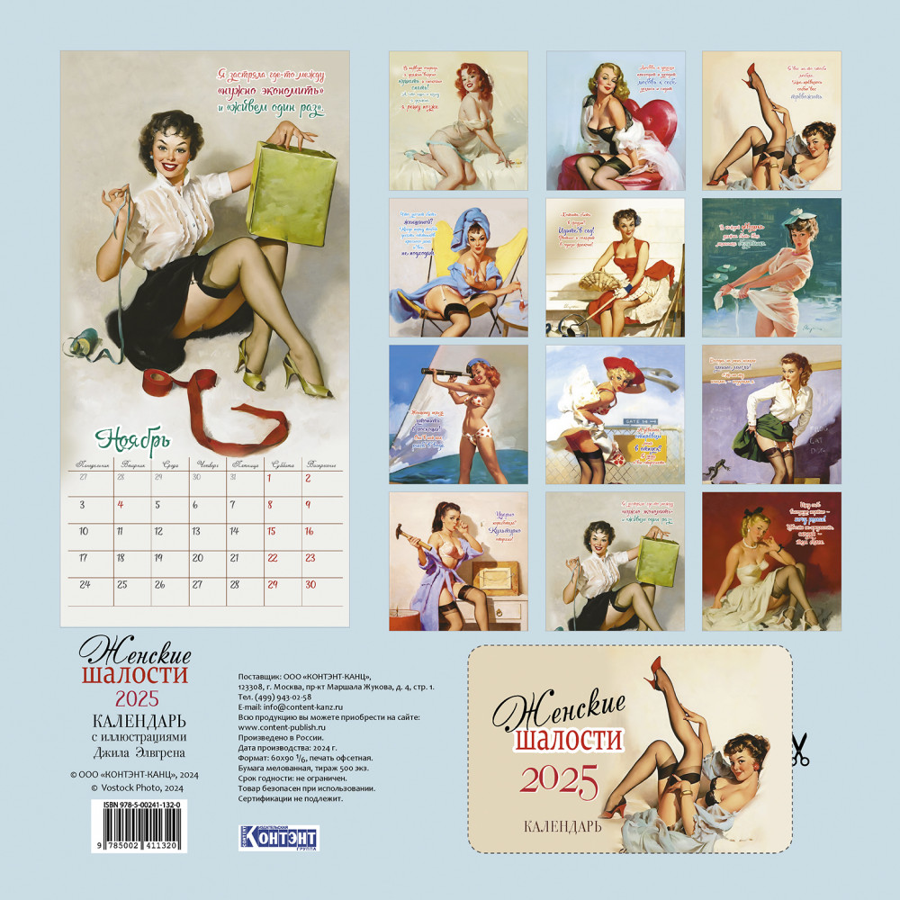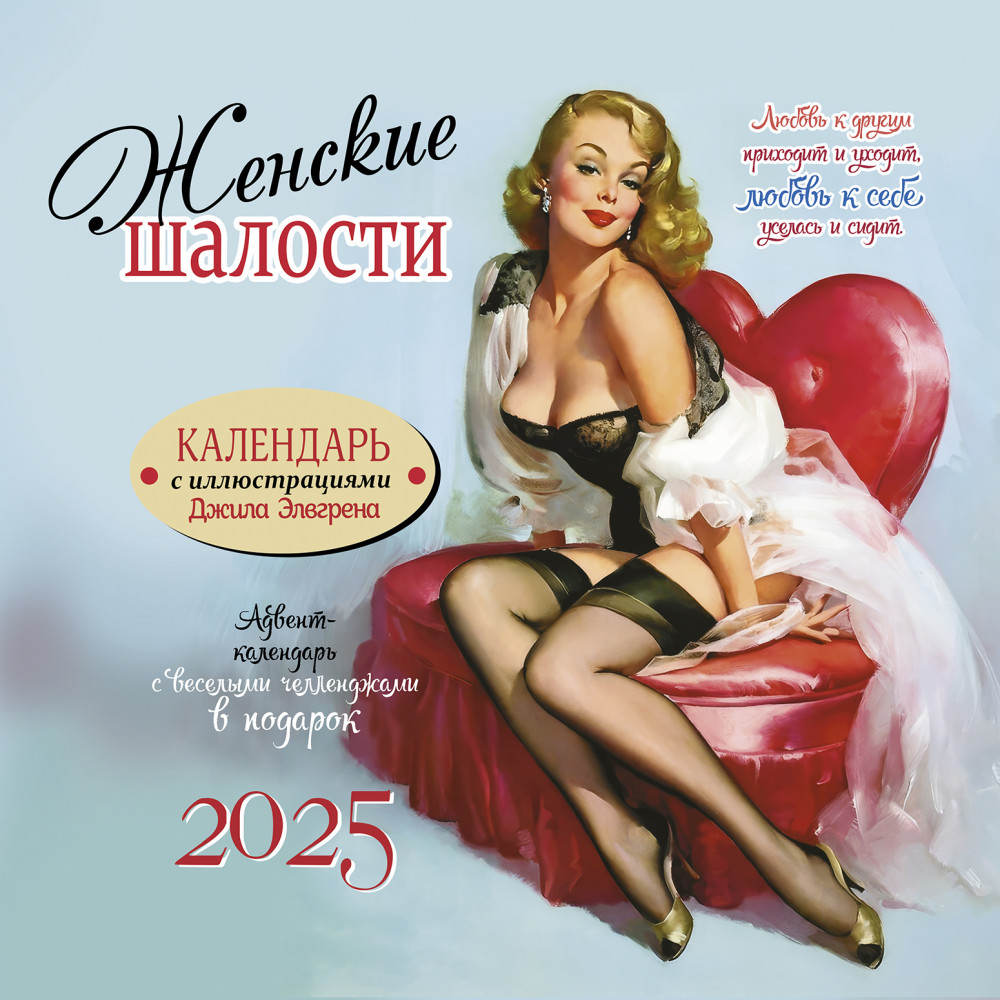 Календарь-органайзер на 2025 год «Женские шалости»В данный момент этот товар отсутствует в продаже. Возможно, у нас найдется аналогичный или похожий товар здесь. Серия: Календарь-органайзер Погрузитесь в ретро-очарование с нашим календарем, собравшим одни из лучших работ Джила Элвгрена, известного американского художника и иллюстратора ХХ века. Культовые иллюстрации в стиле пинап, полные жизнерадостности и кокетства, гарантированно подарят вам хорошее настроение, а забавные фразы непременно заставят улыбнуться даже в самый пасмурный день. Пусть этот год будет наполнен юмором, радостью и неподвластной времени красотой. |