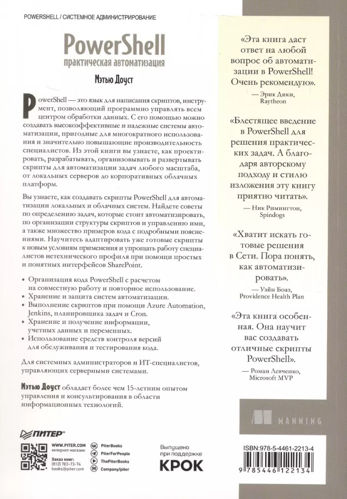💳 Оплатить за товар можно при получении 🇰🇿 Есть бесплатная доставка по Казахстану от 1 дня 🎁 Копите бонусы с каждой покупки Серия: Библиотека программиста PowerShell — это язык для написания скриптов, инструмент, позволяющий программно управлять всем центром обработки данных. С его помощью можно создавать высокоэффективные и надежные системы автоматизации, пригодные для многократного использования и значительно повышающие производительность специалистов. Из этой книги вы узнаете, как проектировать, разрабатывать, организовывать и развертывать скрипты для автоматизации задач любого масштаба: от локальных серверов до корпоративных облачных платформ. |