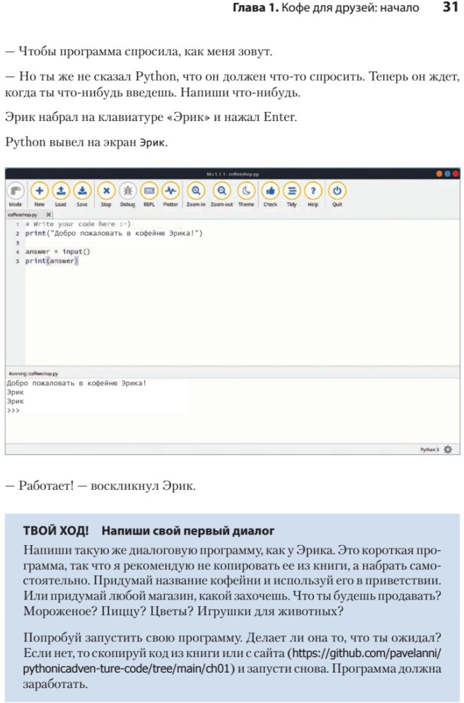 💳 Оплатить за товар можно при получении 🇰🇿 Есть бесплатная доставка по Казахстану от 1 дня 🎁 Копите бонусы с каждой покупки Серия: Библиотека программиста Программирование — это приключение, полное трудностей, нового опыта, побед и поражений. В книге «Поговорим на Python» вы присоединитесь к Эрику и Саймону, которые учатся программировать на Python и создают свое первое приложение. Книга написана специально для будущих программистов и идеальна, чтобы начать осваивать навык, который останется на всю жизнь! |
