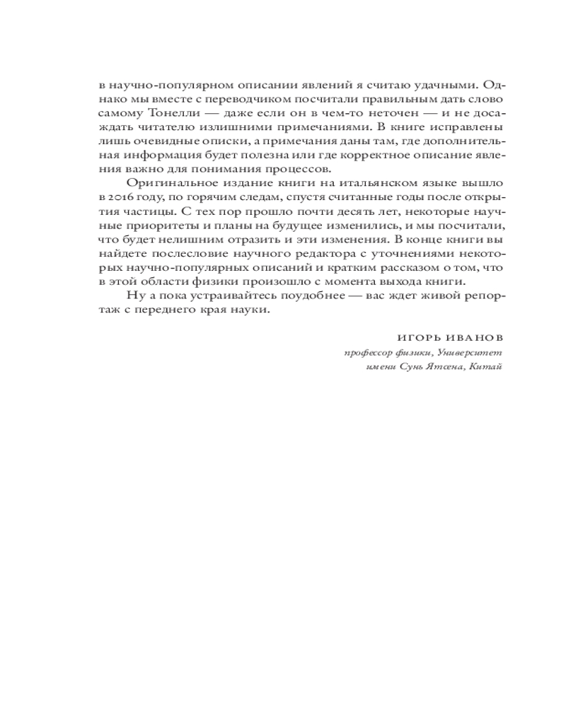 💳 Оплатить за товар можно при получении 🇰🇿 Есть бесплатная доставка по Казахстану от 1 дня 🎁 Копите бонусы с каждой покупки Серия: Элементы 2.0 Гвидо Тонелли — один из авторитетнейших современных физиков-экспериментаторов, профессор Университета Пизы, сотрудник Европейской организации по ядерным исследованиям, автор множества статей и нескольких научно-популярных книг. В «Тончайшем несовершенстве, что порождает всё» он рассказывает об открытии одной из самых загадочных элементарных частиц — бозона Хиггса. Тонелли был непосредственным участником описываемых событий, он работал на Большом адронном коллайдере, являлся официальным представителем эксперимента по поиску бозона Хиггса, и потому его рассказ о том, как совершалось самое важное за последние десятилетия открытие в физике элементарных частиц, получился очень живым и личным. |