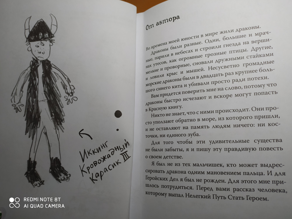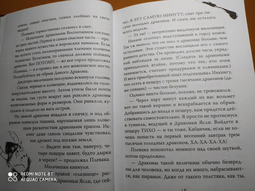 Хоть я уже очень давно как не в среднем школьном возрасте было приятно почитать, быть может потому что очень люблю тему викингов и вообще фанат мультфильма. Хоть книга значительно и отличается от него, понравилось не меньше. Обилие иллюстраций также сыграло положительную роль на мое мнение. Мне понравилось, что они сделаны как бы в детской манере. Понравилось и приложение о драконах, так как всегда хотелось подержать в руках нечто подобное после увиденья "драконьей книги" в мультике, или хотя бы нечто похожее.