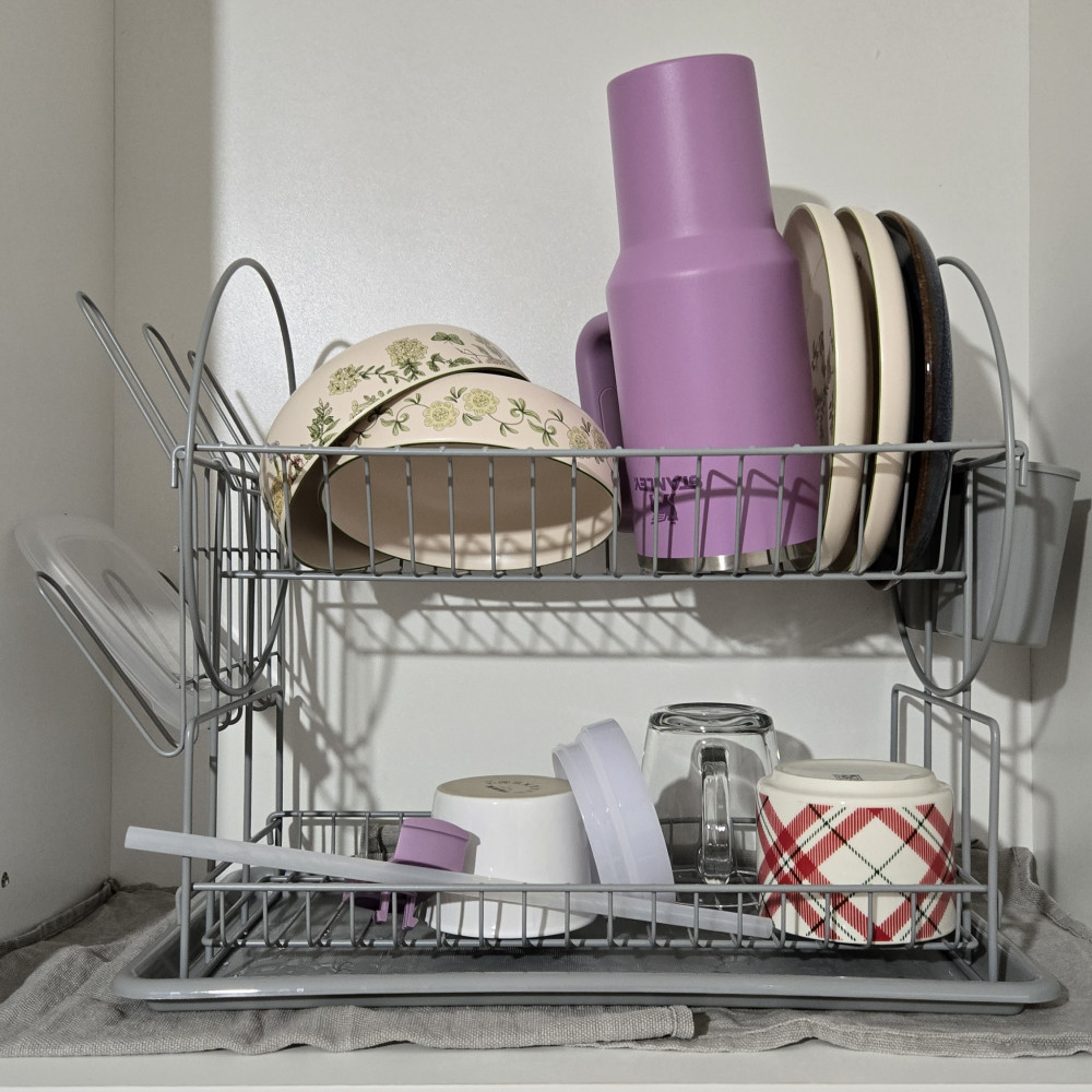 сушилка отличная - легко собирается и разбирается, коробка от неё небольшая, удобно будет при переезде (не займёт много места), вместитительность средняя, но мне на одного - достаточно. удобно что есть отделы для приборов и чашек и что главное они съёмные - можно убрать есть поддон