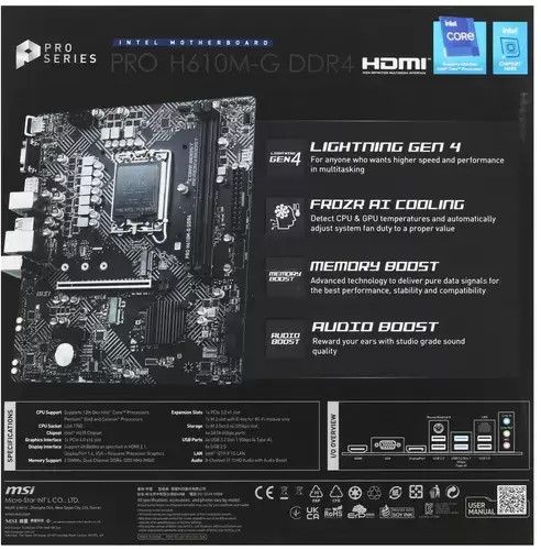 MSI Материнская плата PRO H610M-GВ данный момент этот товар отсутствует в продаже. Возможно, у нас найдется аналогичный или похожий товар здесь. Материнская плата MSI PRO H610M-G DDR4 предназначена для процессоров на сокете LGA 1700 и использует чипсет Intel H610. Она поддерживает оперативную память DDR4 с двумя слотами, позволяя установить до 64 ГБ ОЗУ. Плата оснащена слотом M.2 для установки высокоскоростного SSD, а также графическими выходами HDMI, DisplayPort и D-Sub (VGA) для подключения мониторов. Форм-фактор mATX (Micro ATX) обеспечивает совместимость с компактными корпусами. Эта плата предлагает хорошую функциональность для сборки среднего уровня ПК с поддержкой различных стандартов подключения и расширения. |