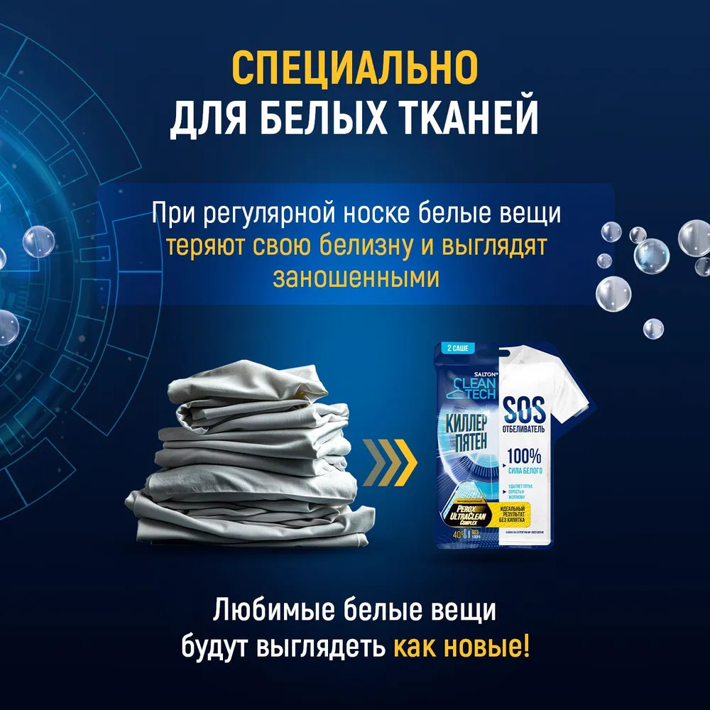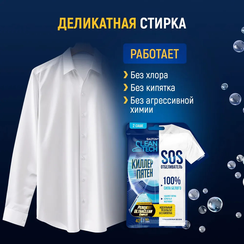 Отбеливатель для белья «SOS» возвращает ослепительно белый оттенок вещам, бережно воздействуя на структуру ткани. Усиленная формула с оптическим отбеливателем последнего поколения эффективно устраняет серость и желтизну, возвращая яркость белого цвета. Любимая вещь будет выглядеть как новая! Внутри упаковки 2 саше по 40 г.