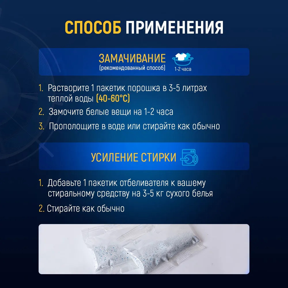 Способ применения: усиление стирки: содержимое 1 пакета добавьте к вашему стиральному средству на 3-5 кг сухого белья. Стирайте как обычно. Отбеливание/пятновыведение: содержимое 1 пакета растворите в 3-5 литрах теплой воды (40-60°С) и замочите белые вещи на 1-2 часа. Прополощите в воде или стирайте как обычно. Удаление застарелых пятен: размешайте 20 г (половину пакета) средства в 50 мл теплой воды (40°С), нанесите на пятно на 15 минут, затем прополощите в воде и стирайте как обычно.