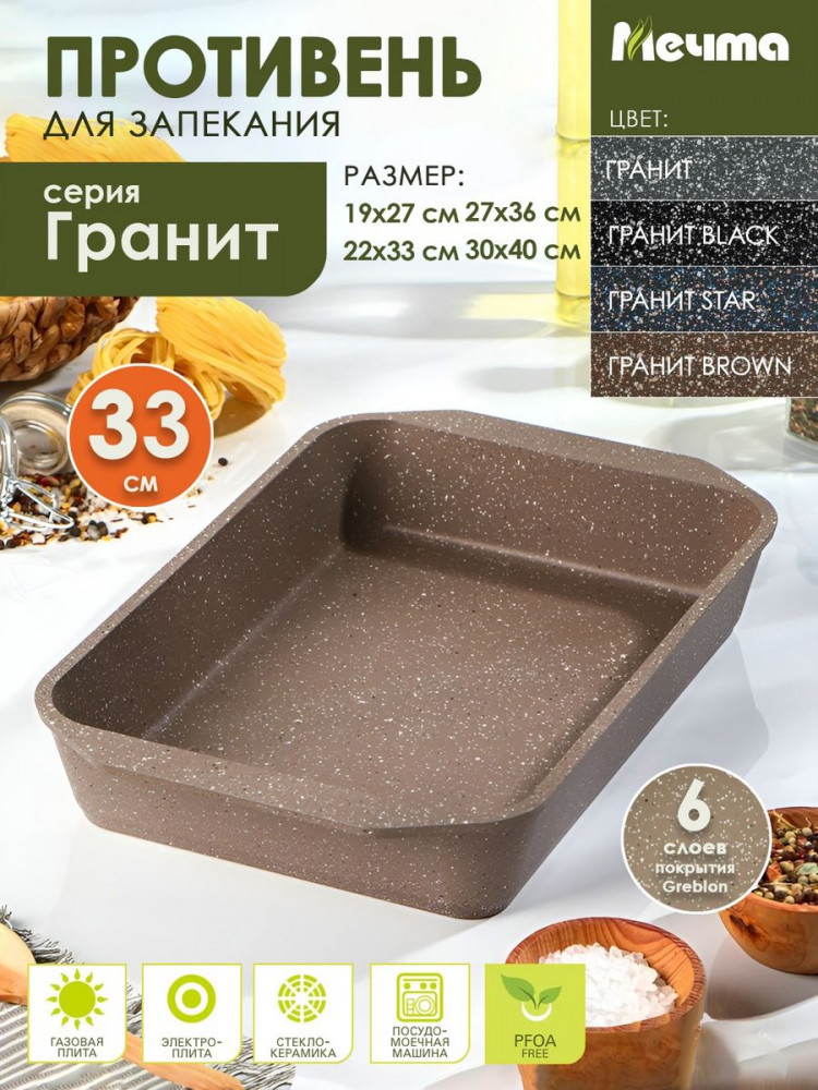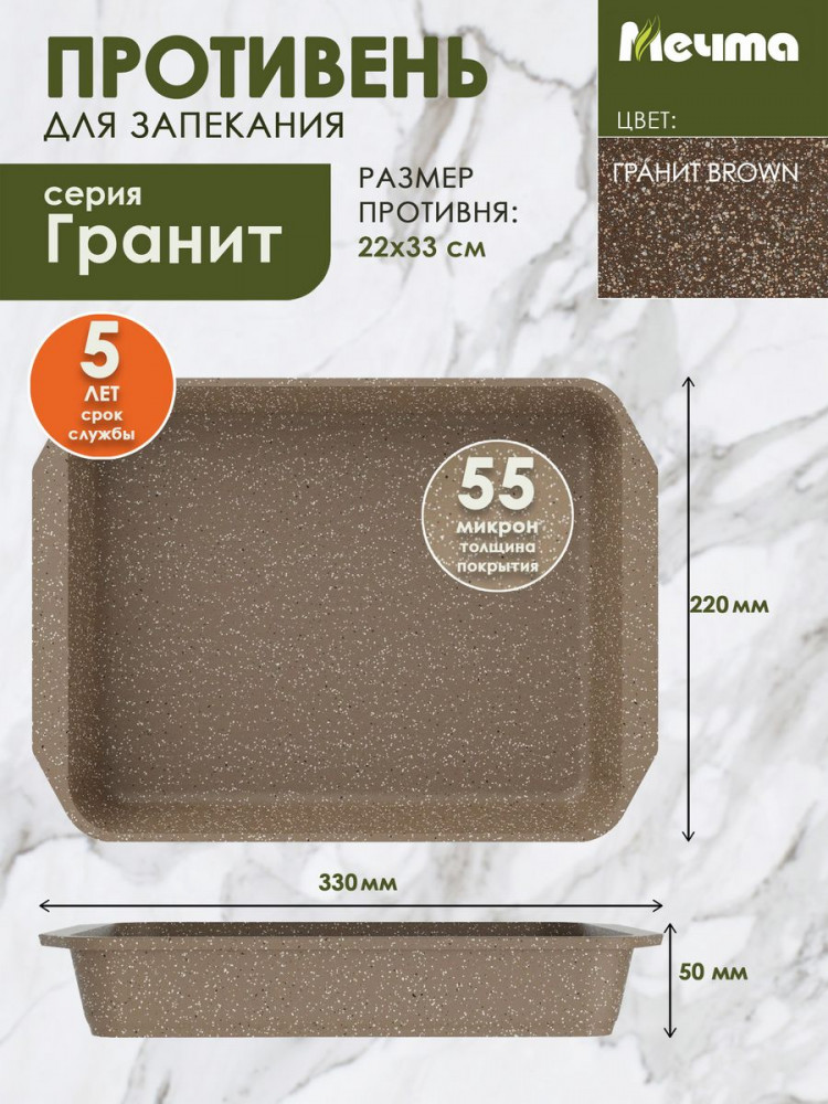 Мечта Противень «Гранит»В данный момент этот товар отсутствует в продаже. Возможно, у нас найдется аналогичный или похожий товар здесь. Серия: Гранит Brown Противень из литого толстостенного алюминия «Мечта» станет незаменимым инструментом и надежным помощником на вашей кухне. Отлично подойдет для приготовления разнообразных блюд из мяса, рыбы и овощей. Благодаря термоаккумулирующим свойствам алюминия пища не пригорает, а томится. Новейшая формула сверхпрочного антипригарного покрытия позволяет готовить при минимальном количестве масла не переживая о том, что пища может пригореть. С посудой ТМ «Мечта» можно жарить, тушить и варить без потерь вкусовых и полезных качеств продуктов. |