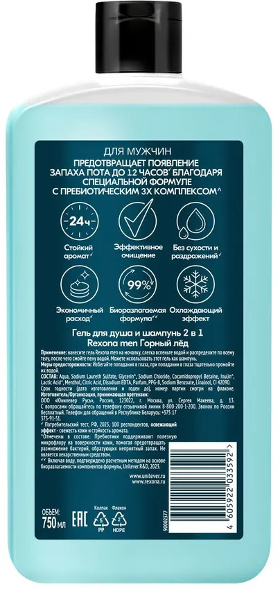 Rexona Гель для душа и шампунь мужской «Горный лед»