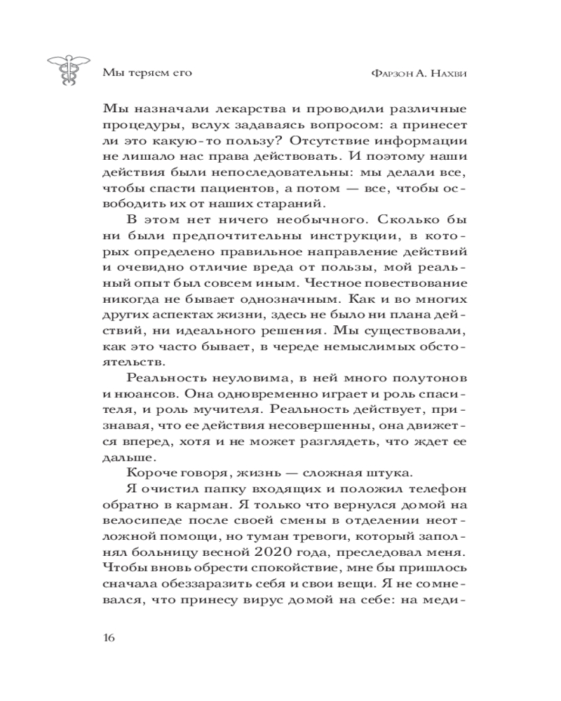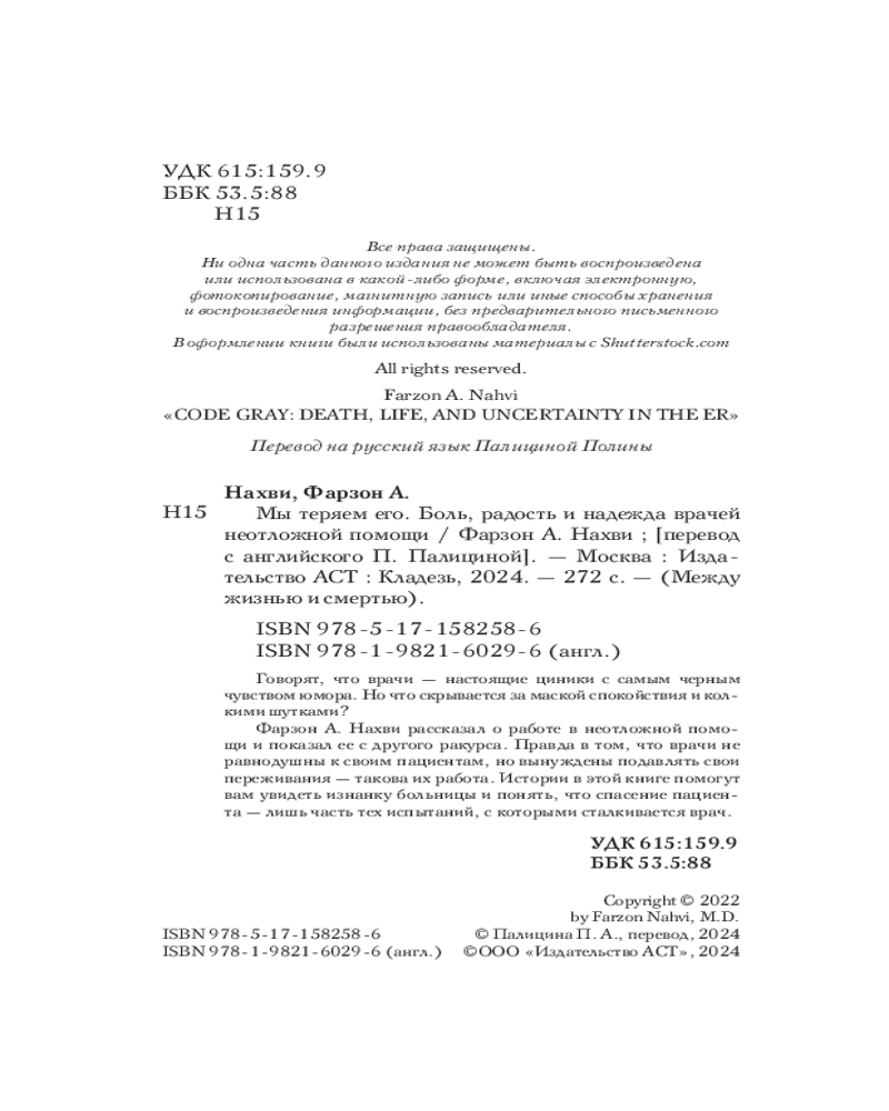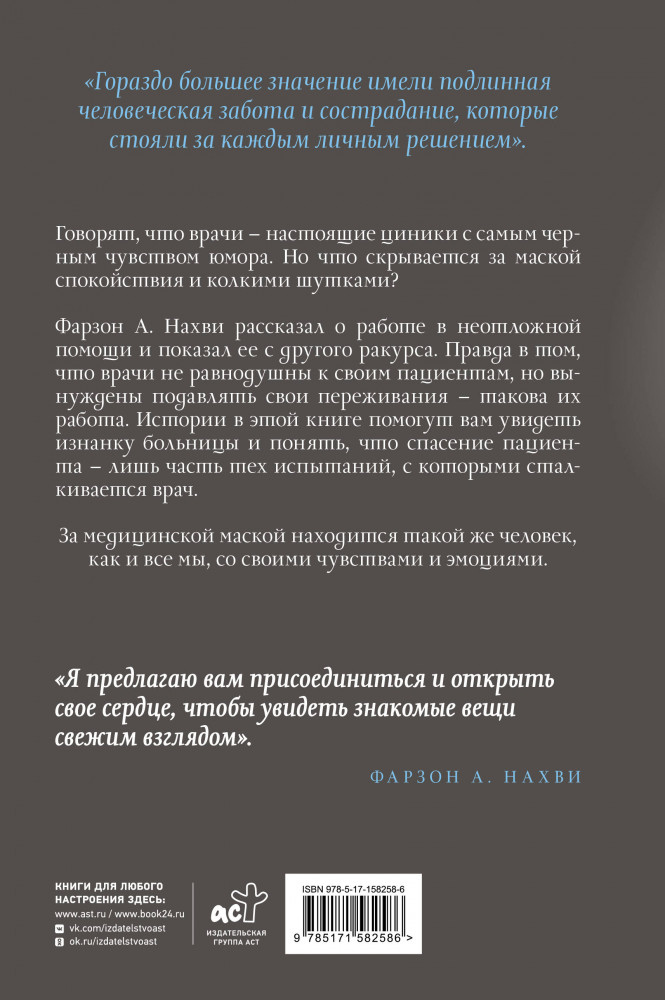 💳 Оплатить за товар можно при получении 🇰🇿 Есть бесплатная доставка по Казахстану от 1 дня 🎁 Копите бонусы с каждой покупки Серия: Между жизнью и смертью Говорят, что врачи — настоящие циники с самым черным чувством юмора. Но что скрывается за маской спокойствия и колкими шутками? Фарзон А. Нахви рассказал о работе в неотложной помощи и показал ее с другого ракурса. Правда в том, что врачи не равнодушны к своим пациентам, но вынуждены подавлять свои переживания — такова их работа. Истории в этой книге помогут вам увидеть изнанку больницы и понять, что спасение пациента — лишь часть тех испытаний, с которыми талкивается врач. |