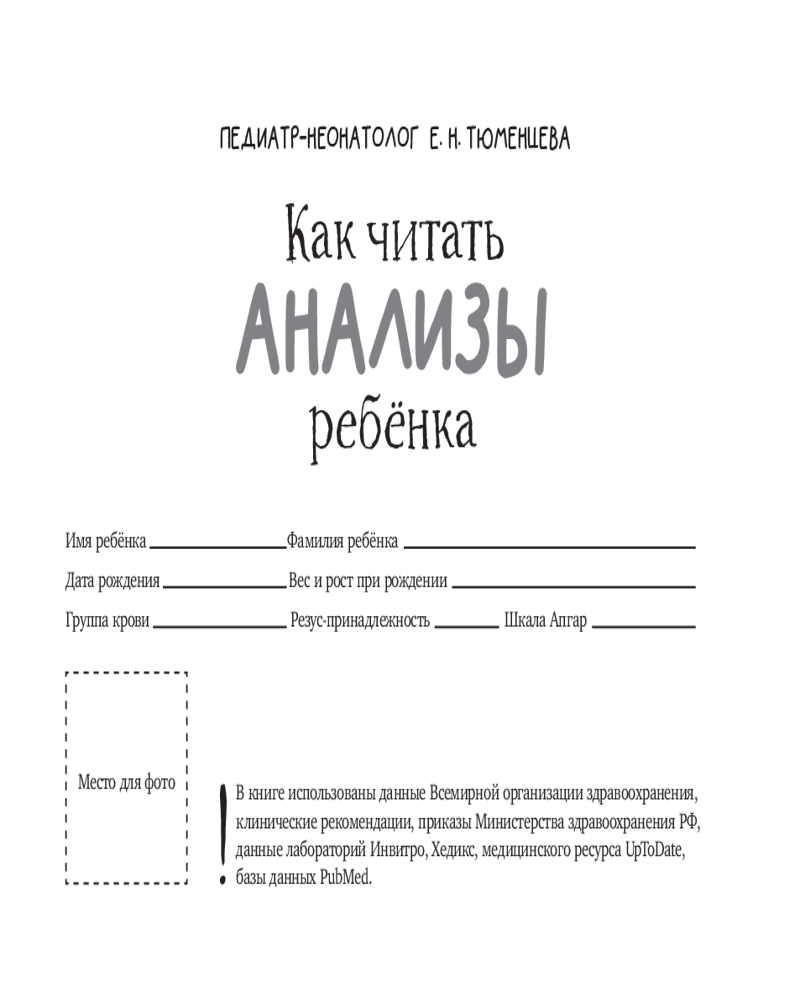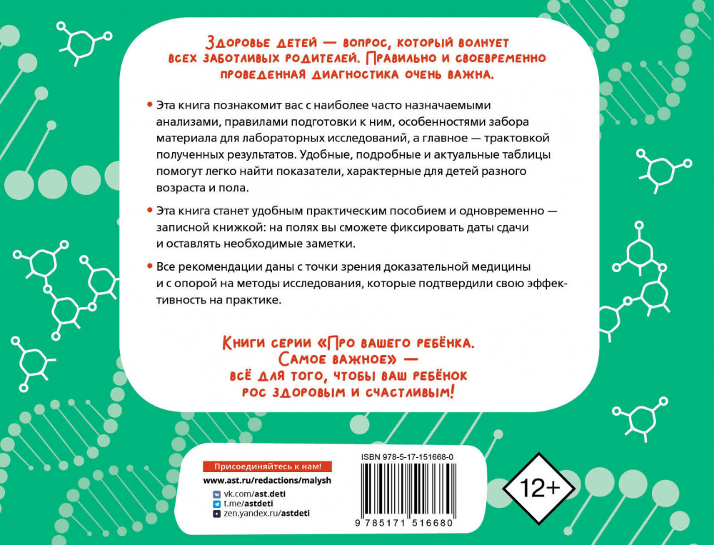 💳 Оплатить за товар можно при получении 🇰🇿 Есть бесплатная доставка по Казахстану от 1 дня 🎁 Копите бонусы с каждой покупки Серия: Про вашего ребенка: подробно и в деталях Здоровье детей — вопрос, который волнует всех заботливых родителей. Правильно и своевременно проведенная диагностика очень важна. Эта книга познакомит вас с наиболее часто назначаемыми анализами, правилами подготовки к ним, особенностями забора материала для лабораторных исследований, а главное — трактовкой полученных результатов. Удобные, подробные и актуальные таблицы помогут легко найти показатели, характерные для детей разного возраста и пола. Эта книга станет удобным практическим пособием и одновременно — записной книжкой: на полях вы сможете фиксировать даты сдачи и оставлять необходимые заметки. Все рекомендации даны с точки зрения доказательной медицины и с опорой на методы исследования, которые подтвердили свою эффективность на практике. В книгах серии «Про вашего ребенка: подробно и в деталях» есть всё для того, чтобы ваш ребенок рос здоровым и счастливым! |