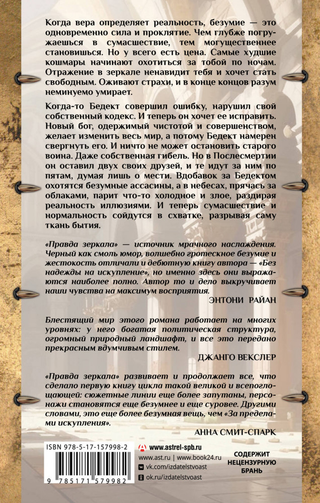 💳 Оплатить за товар можно при получении 🇰🇿 Есть бесплатная доставка по Казахстану от 1 дня 🎁 Копите бонусы с каждой покупки Серия: Шедевры фэнтези Когда вера определяет реальность, безумие — это одновременно сила и проклятие. Чем глубже погружаешься в сумасшествие, тем могущественнее становишься. Но у всего есть цена. Самые худшие кошмары начинают охотиться за тобой по ночам. Отражение в зеркале ненавидит тебя и хочет стать свободным. Оживают страхи, и в конце концов разум неминуемо умирает. Когда-то Бедект совершил ошибку, нарушил свой собственный кодекс. И теперь он хочет ее исправить. Новый бог, одержимый чистотой и совершенством, желает изменить весь мир, а потому Бедект намерен свергнуть его. И ничто не может остановить старого воина. Даже собственная гибель. Но в Послесмертии он оставил двух своих друзей, и те идут за ним по пятам, думая лишь о мести. Вдобавок за Бедектом охотятся безумные ассасины, а в небесах, прячась за облаками, парит что-то холодное и злое, раздирая реальность иллюзиями. И теперь сумасшествие и нормальность сойдутся в схватке, разрывая саму ткань бытия. |