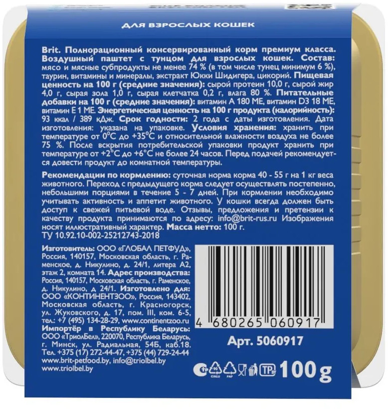 Brit Паштет для взрослых кошек с тунцом