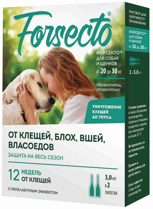 Упаковка лекарственного препарата Forsecto® содержит две пипетки для обеспечения защиты от иксодовых клещей на сезон со средней продолжительностью 10 недель у кошек и 12 недель у собак и щенков; от вшей, блох и власоедов на период со средней продолжительностью 14 недель у кошек и 16 недель у собак и щенков.