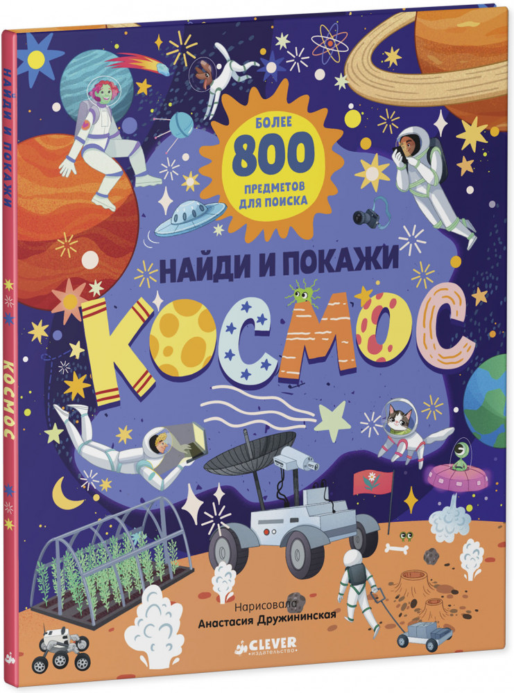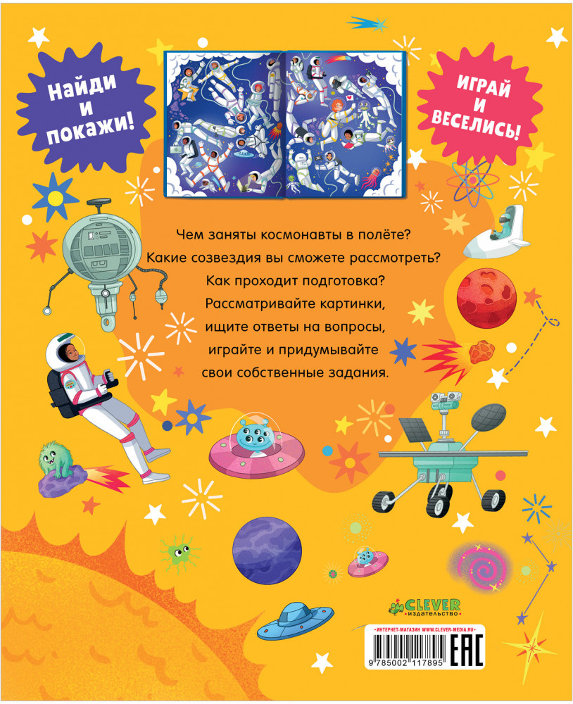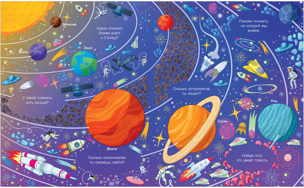 Открывайте большую книгу «Найди и покажи. Космос», рассматривайте картинки, ищите ответы на вопросы, играйте и придумывайте свои собственные истории и задания.