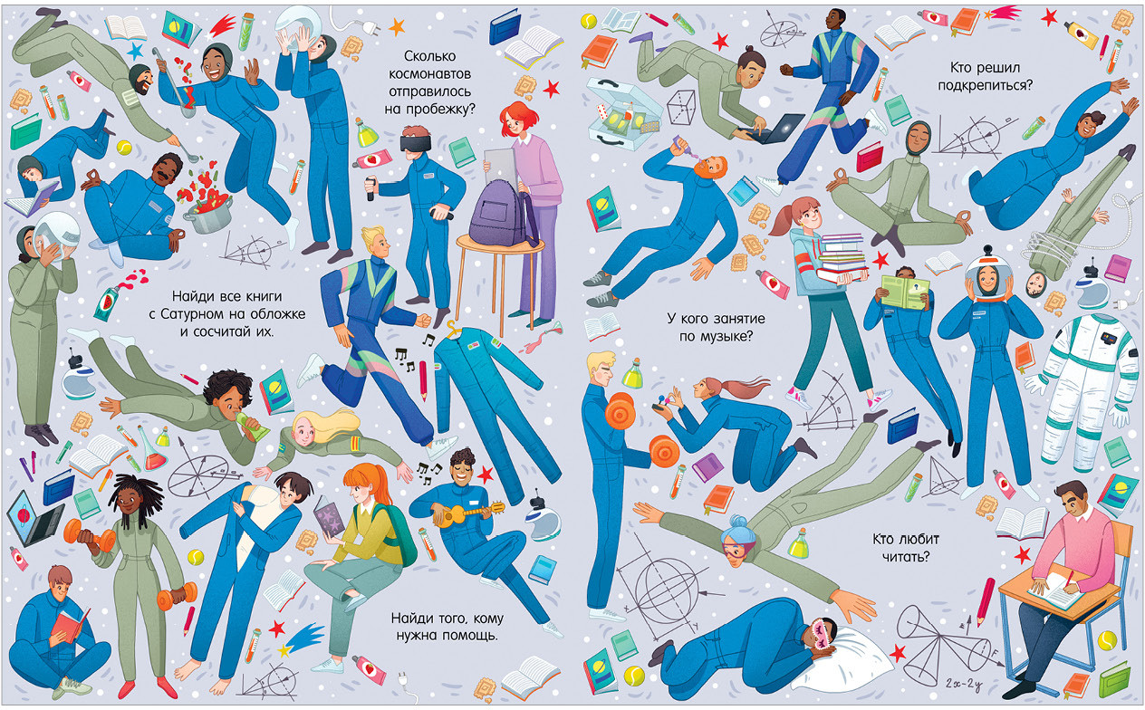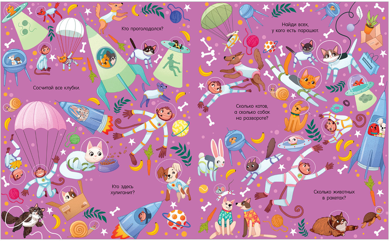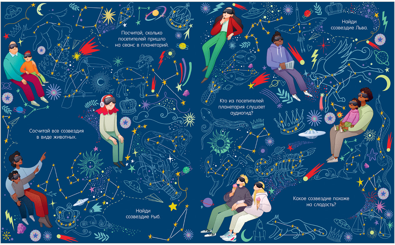 В книге «Найди и покажи. Космос» на каждом развороте есть смешные вопросы на сообразительность и внимание. У кого из космонавтов растут усы? Сколько вы видите одноглазых пришельцев?