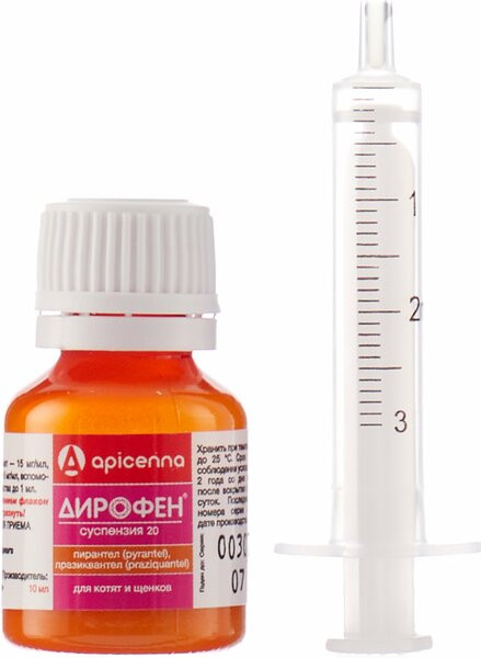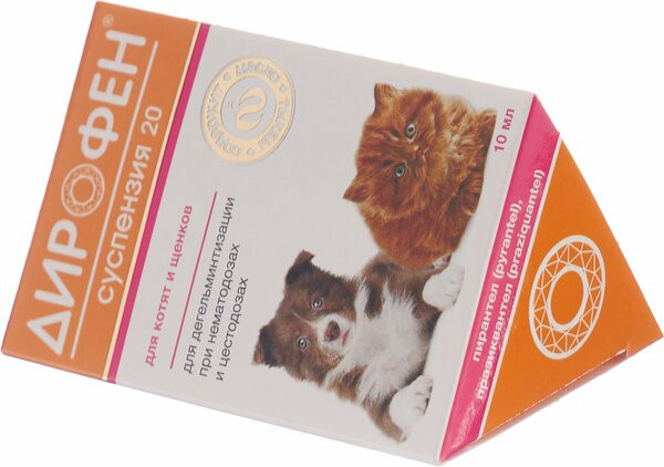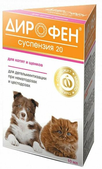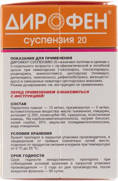 Дирофен-суспензию 20 назначают щенкам и котятам с 3-недельного возраста с профилактической и лечебной целью при нематодозах (токсокароз, токсаскаридоз, унцинариоз, анкилостомоз), цестодозах (тениидоз, дипилидиоз, эхинококкоз, дифиллоботриоз, мезоцестоидоз) и смешанных нематодо-цестодозных инвазиях.