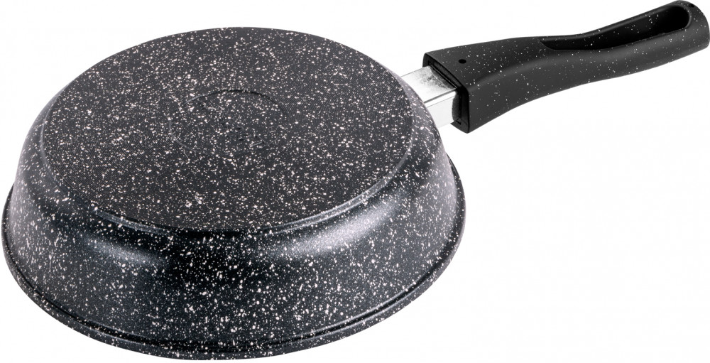 Литая алюминиевая сковорода с антипригарным покрытием — оригинальная посуда ТМ Горница, которая подходит для газовых, электрических, стеклокерамических плит. Необходима для приготовления различных продуктов: мяса, овощей, рыбы и т. д. Коллекция «Гранит» «мраморной посуды» с улучшенным четырёхслойным антипригарным покрытием. Дополнительный слой с мраморным эффектом увеличивает износостойкость и создаёт оттенок чёрного мрамора. Сковорода литая изготовлена из пищевого алюминия без канцерогенных веществ.