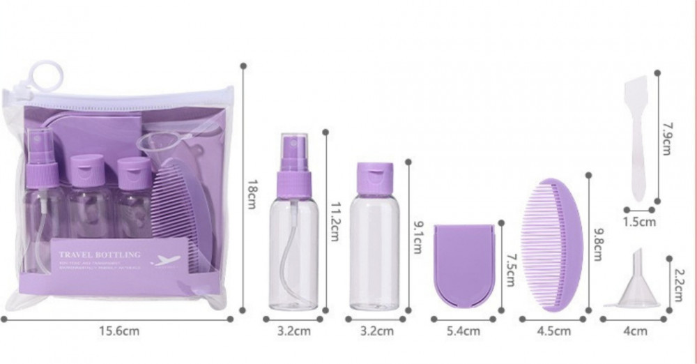 В набор входит: флакон с носиком-дозатором 30 мл, с распылителем 30 мл, с крышкой-дозатором 30 мл, зеркало, расчёска, а так же набор оснащён полезными аксессуарами — лопатка и воронка для быстрого и удобного наполнения флаконов вашими любимыми средствами. Все тюбики имеют формат до 100 мл — идеально подходят для ручной клади.