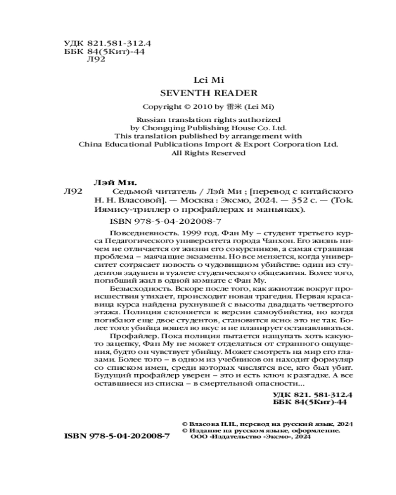💳 Оплатить за товар можно при получении 🇰🇿 Есть бесплатная доставка по Казахстану от 1 дня 🎁 Копите бонусы с каждой покупки Серия: Tok. Иямису-триллер о профайлерах и маньяках Мощный психологический триллер. Под угрозой смертельной опасности Фан Му обнаруживает в себе дар профайлинга. |