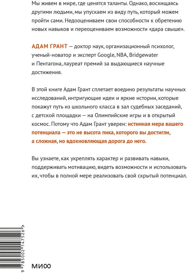 💳 Оплатить за товар можно при получении 🇰🇿 Есть бесплатная доставка по Казахстану от 1 дня 🎁 Копите бонусы с каждой покупки Серия: Идея, которая меняет жизнь Мы живем в мире, восхваляющем вундеркиндов, прирожденных спортсменов, одаренных музыкантов. Однако, восхищаясь людьми с врожденными преимуществами, мы упускаем из виду путь, который можем пройти сами, недооценивая навыки, которыми способны овладеть. Нет предела совершенству. И когда возможности не стучат в вашу дверь, можно открыть ее самостоятельно. |