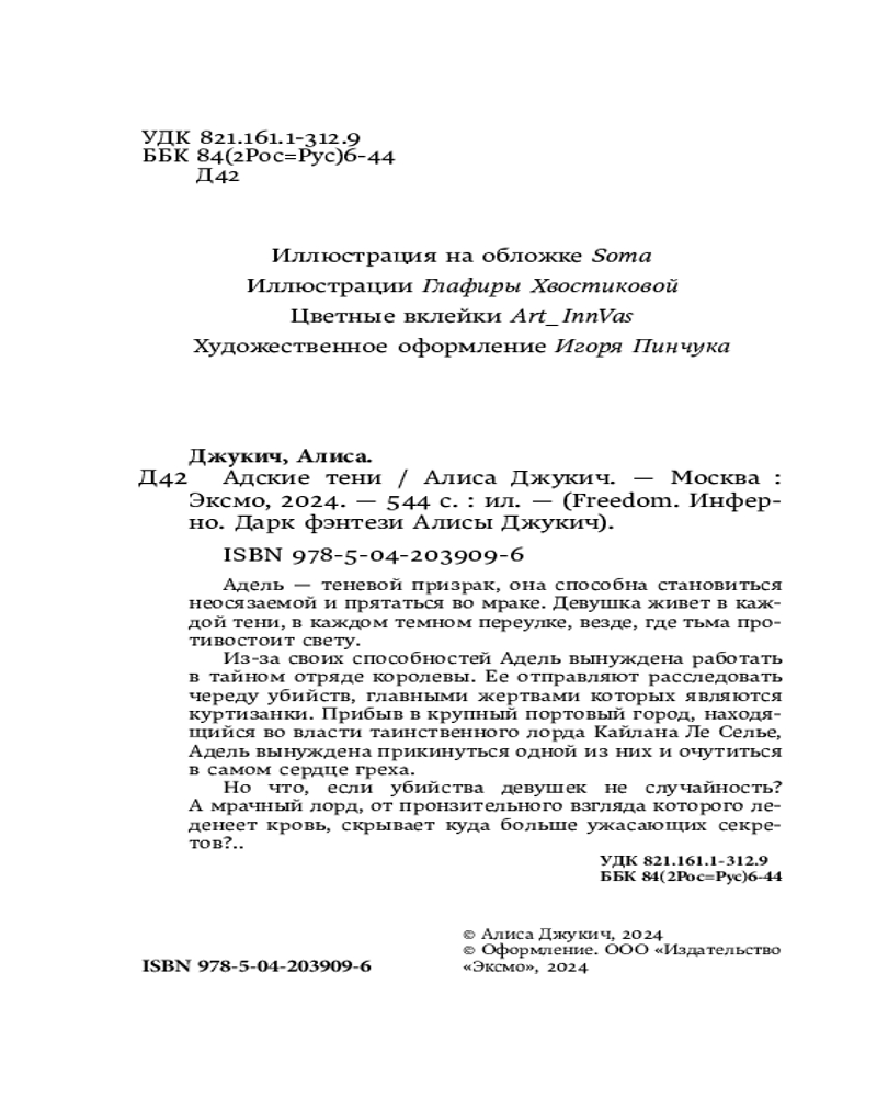 Адские тениВ данный момент этот товар отсутствует в продаже. Возможно, у нас найдется аналогичный или похожий товар здесь. Серия: Freedom. Инферно. Дарк фэнтези Алисы Джукич Новинка популярного российского автора Алисы Джукич! Первая часть захватывающей и полной страсти дилогии «Инферно». Для всех, кто любит dark fantasy с сильной любовной линией в духе «Белладонны» и «Царства греха», а также для поклонников тропа «от ненависти до любви». Потрясающей красоты издание с запечатанными форзацами, цветными вклейками, черно-белыми сюжетными иллюстрациями и картой. Только в первом тираже открытка в подарок! |