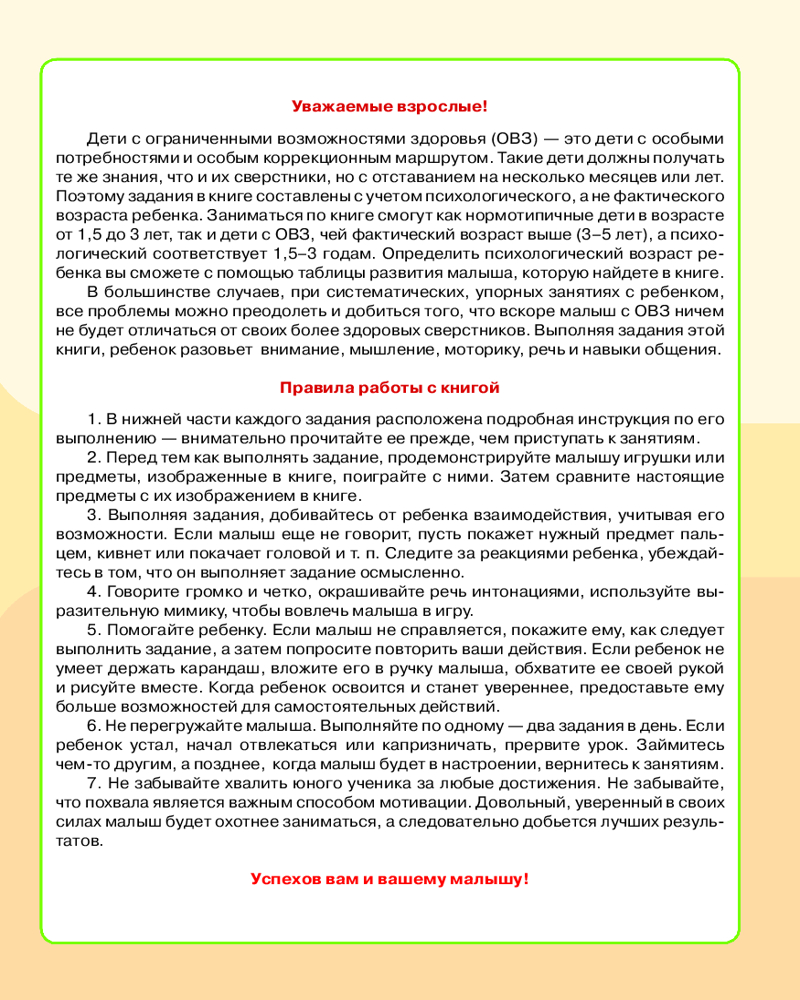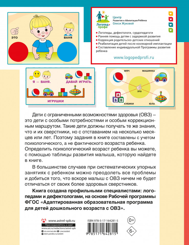 💳 Оплатить за товар можно при получении 🇰🇿 Есть бесплатная доставка по Казахстану от 1 дня 🎁 Копите бонусы с каждой покупки Серия: Особые книги для особых детей Книга предназначена для детей с ограниченными возможностями здоровья (ОВЗ), которые имеют особые потребности и нуждаются в особом коррекционном маршруте. Такие дети должны получать те же знания, что и их сверстники, но с отставанием на несколько месяцев или лет. Поэтому задания в книге составлены с учетом психологического, а не фактического возраста ребенка. Определить психологический возраст ребенка вы сможете с помощью таблицы развития малыша, которую найдете в книге. В большинстве случаев при систематических упорных занятиях можно преодолеть все проблемы и добиться того, что вскоре малыш с ОВЗ ничем не будет отличаться от своих более здоровых сверстников. Для детей с задержкой развития. |