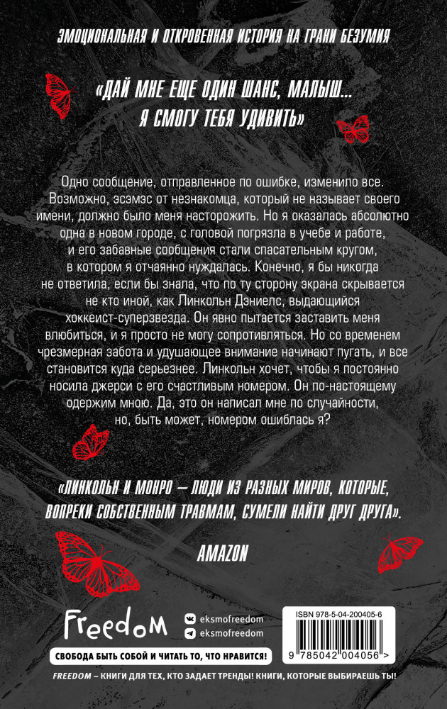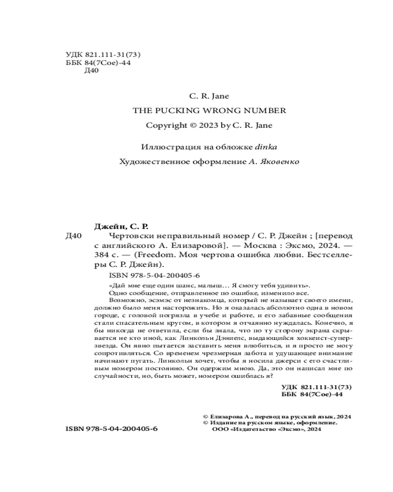 Чертовски неправильный номерВ данный момент этот товар отсутствует в продаже. Возможно, у нас найдется аналогичный или похожий товар здесь. Серия: Freedom. Моя чертова ошибка любви. Бестселлеры С. Р. Джейн Международный бестселлер темной романтики! Настоящий хит буктока в жанре дарк романс! Долгожданная первая книга серии страстных романов популярного зарубежного автора С. Р. Джейн! Для всех поклонников драматичных, захватывающих и чувственных историй любви, а также неоднозначных порочных героев с серой моралью. Эмоциональная и откровенная история на грани разумного. Выбор поклонников Х.Д. Карлтон. |