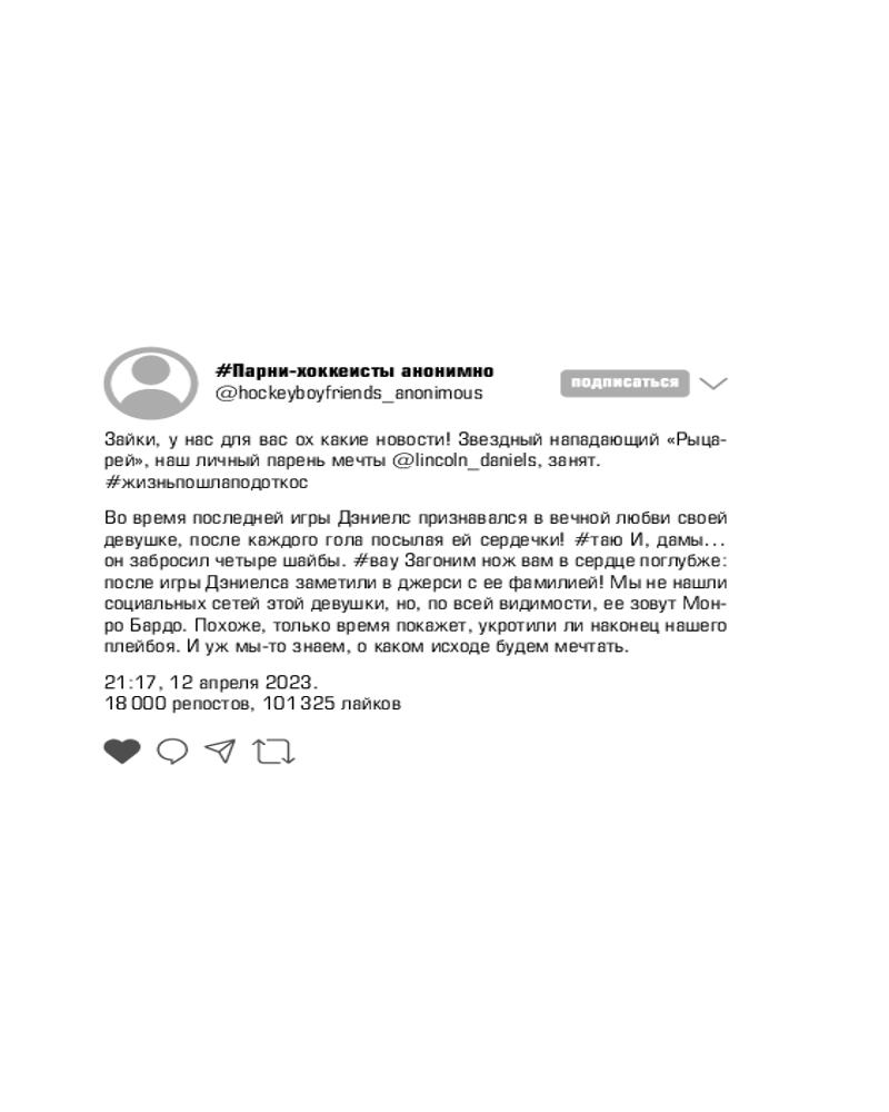 Отличное оформление книги, внутри были стикер и что-то вроде закладки с музыкальным плей листом и на обратной стороне списком игроков «Далласких Рыцарей». Книга на один раз, много моментов 18+. Быстро читается, но все же некоторые поступки героев, если не большая часть остаются под вопросом. Адекватно рассуждающих персонажей как будто нет. За содержание поставила две звезды.