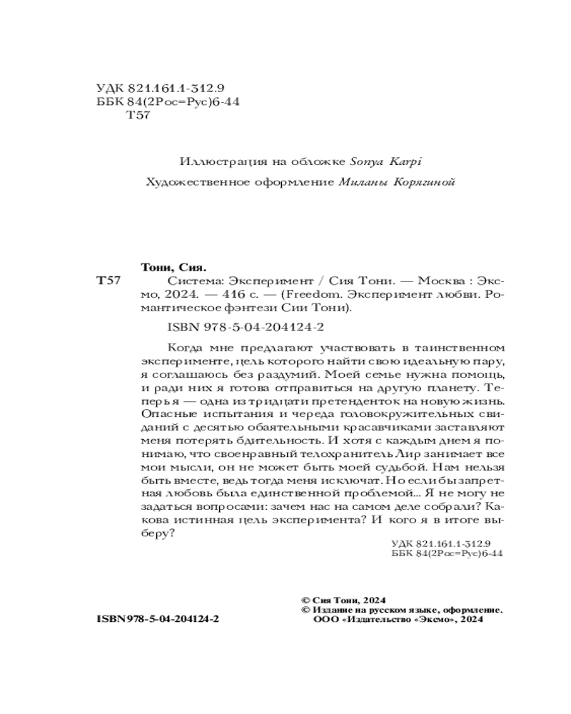 💳 Оплатить за товар можно при получении 🇰🇿 Есть бесплатная доставка по Казахстану от 1 дня 🎁 Копите бонусы с каждой покупки Серия: Freedom. Эксперимент любви. Романтическое фэнтези Сии Тони Притягательная история о девушке, которая становится участницей таинственного любовного эксперимента! Ей предстоит завоевать одного из десяти красавчиков. Но ее телохранитель, отношения с которым запрещены, заставит трепетать не только сердце героини, но и ваше! Внутри книги вас ждет: необычный авторский мир, фэнтези с перчинкой, обратный гарем, запретная любовь и головокружительные приключения! |